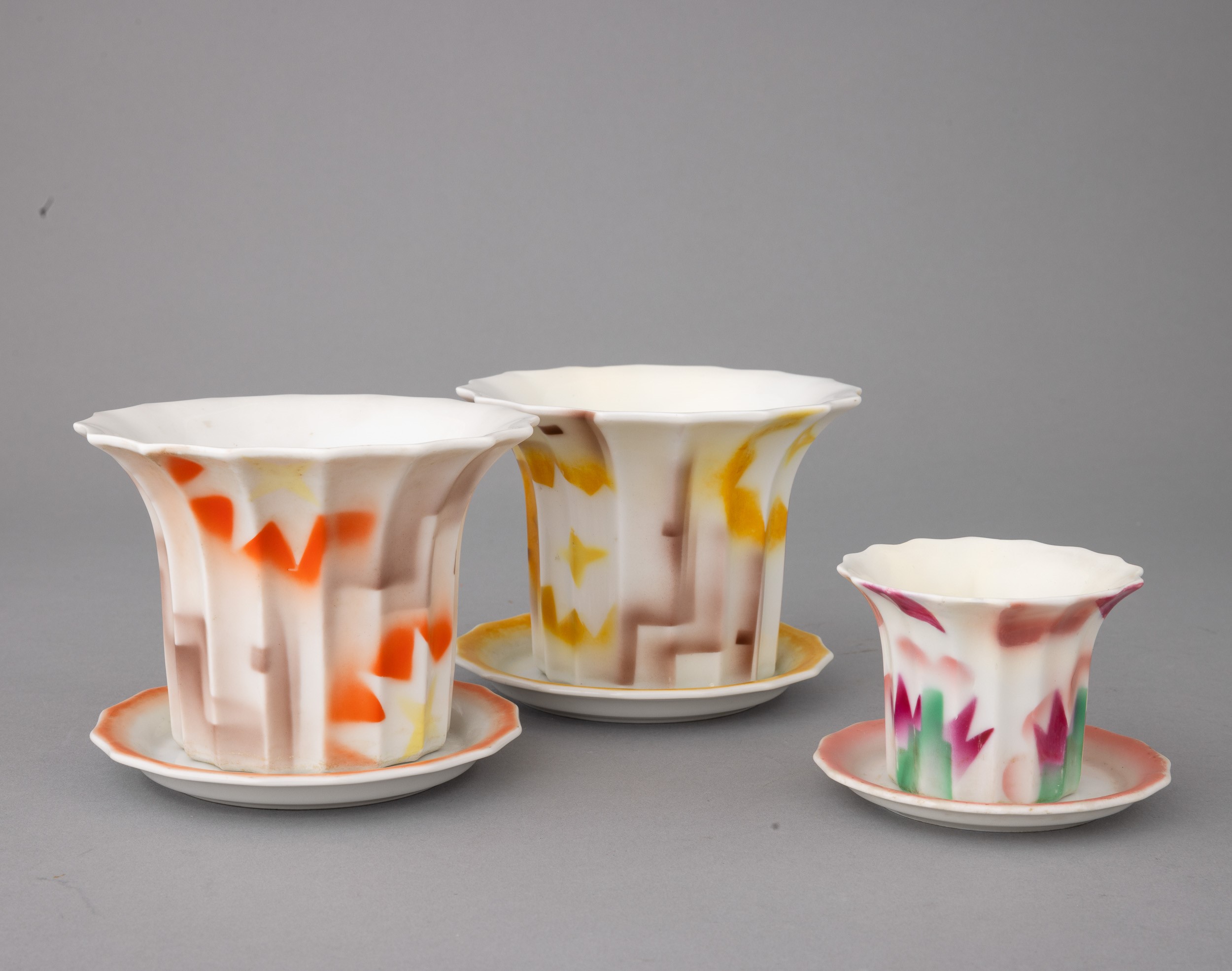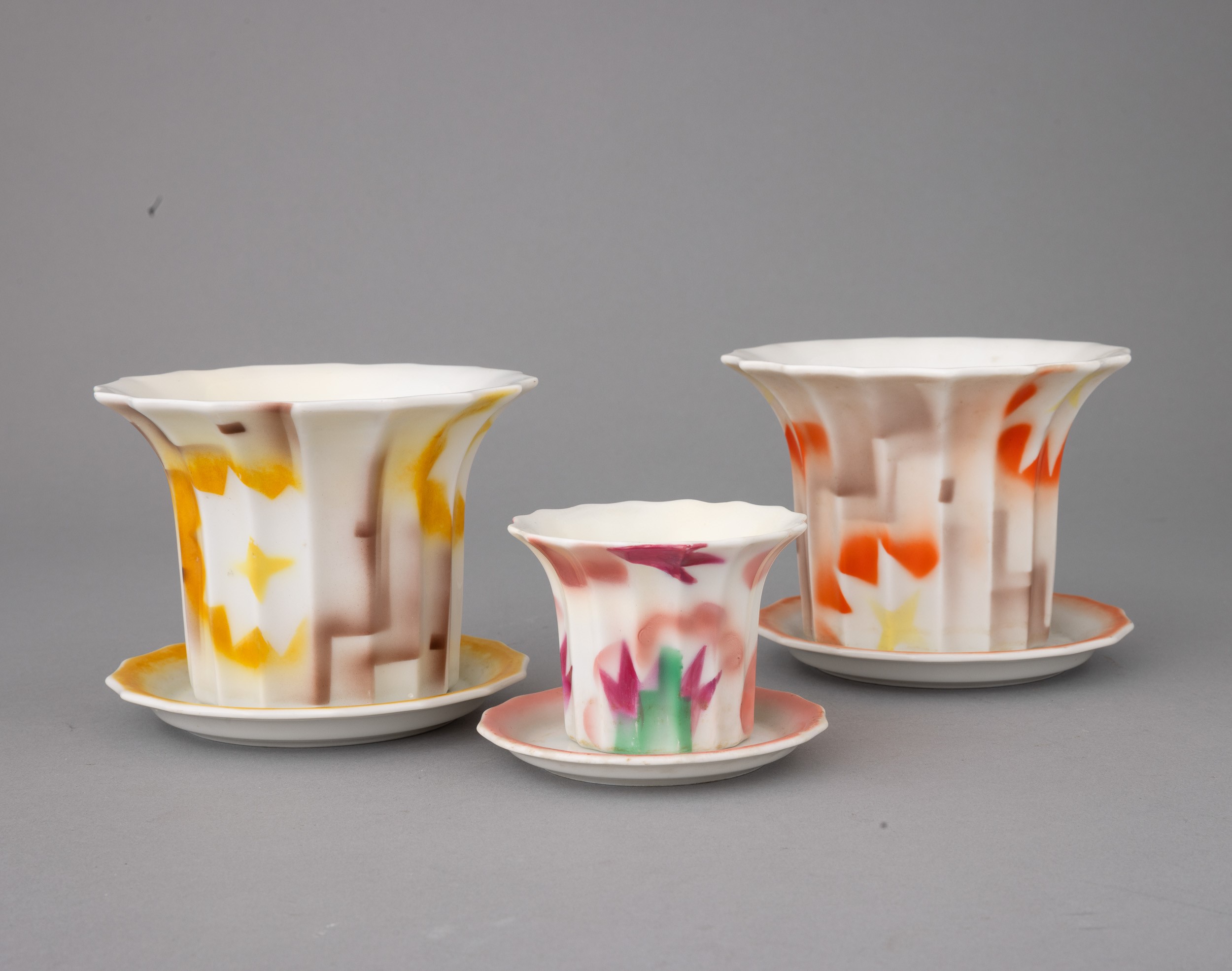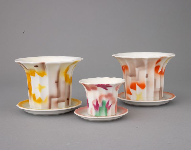 Lotto formato da tre vasi porta piante con relativi sottovasi in porcellana con decoro astratto a smalti policromi.