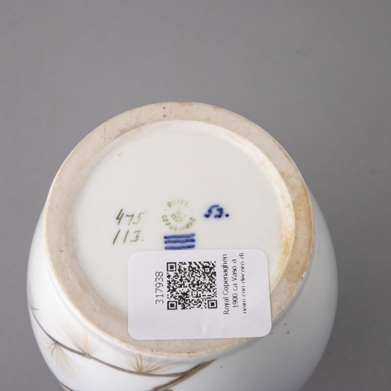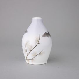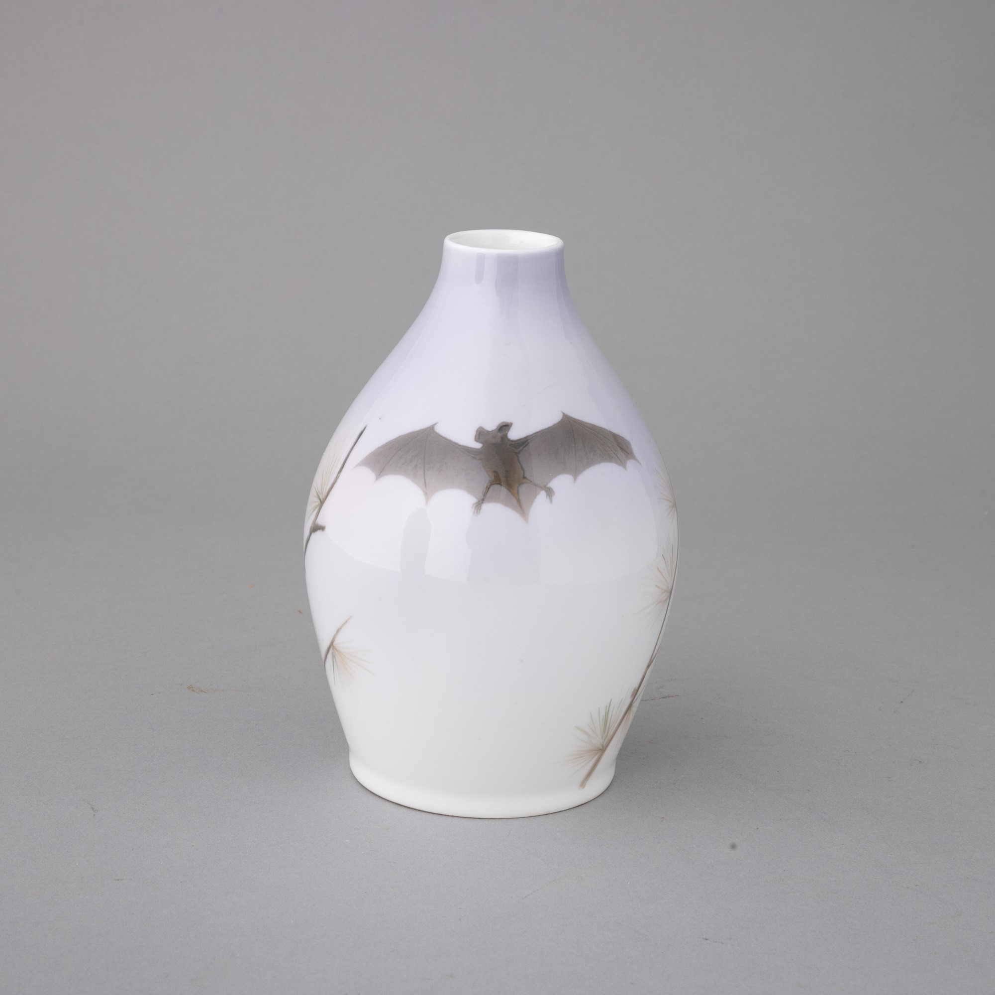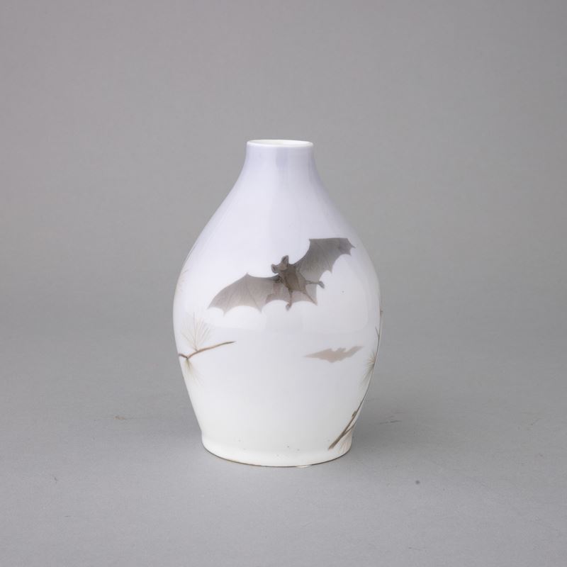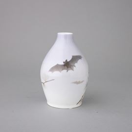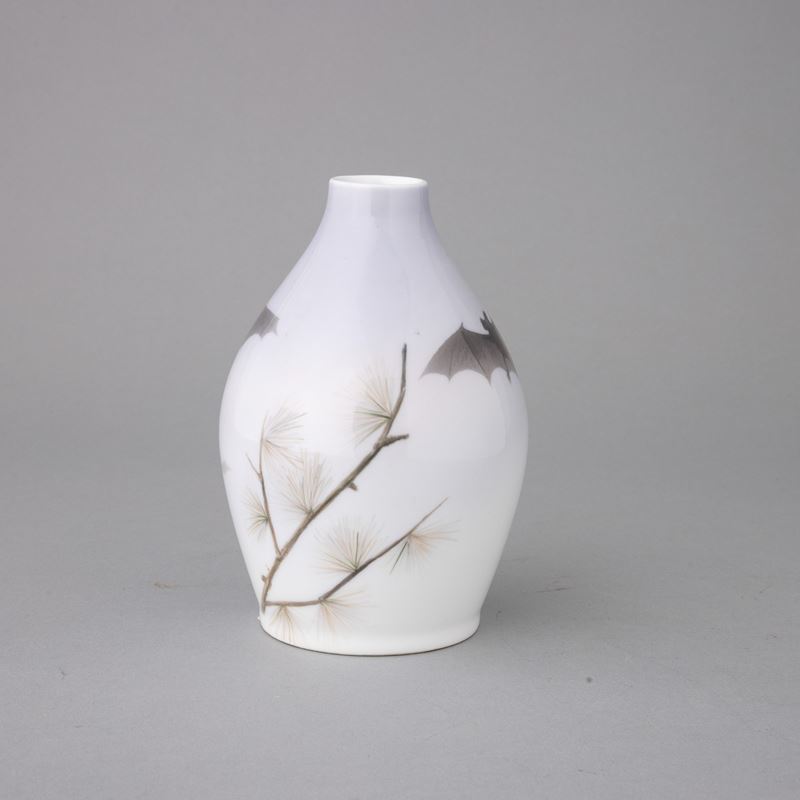 Vaso a uovo in porcellana con decoro di pipistrelli e rami di conifera su fondo sfumato.