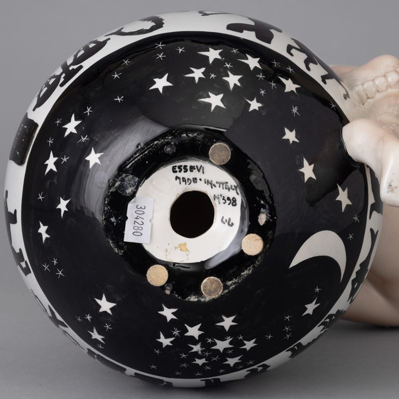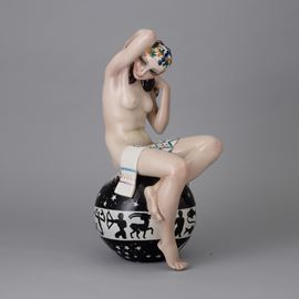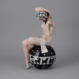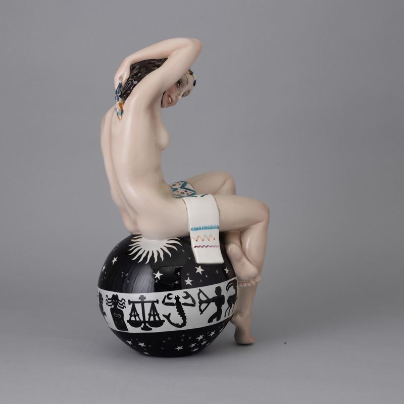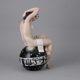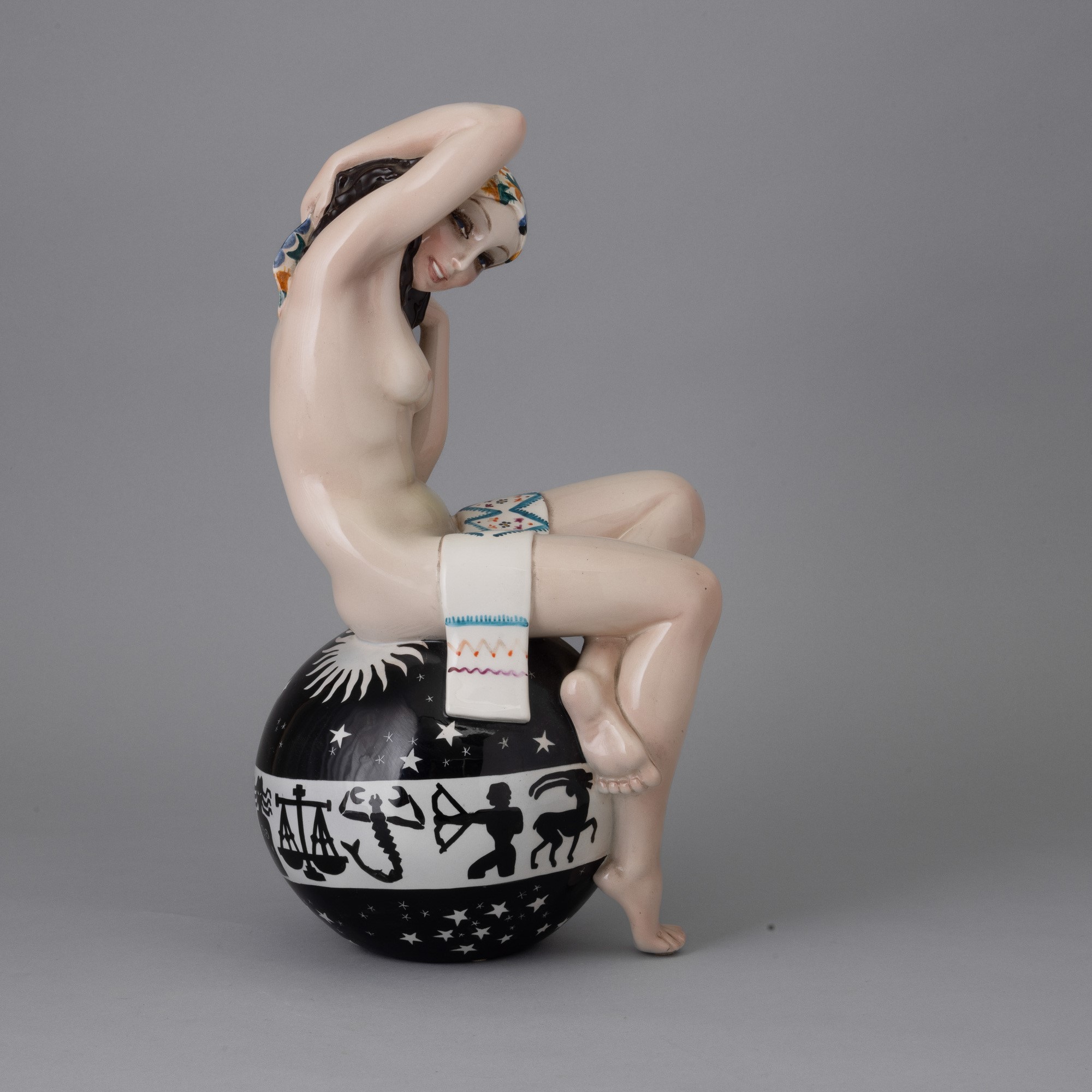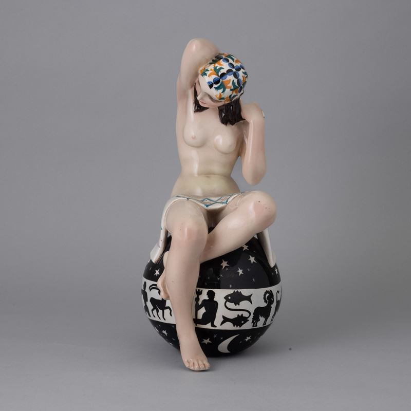 Nudo di donna su sfera con segni zodiacali in terraglia a colaggio con decoro policromo.