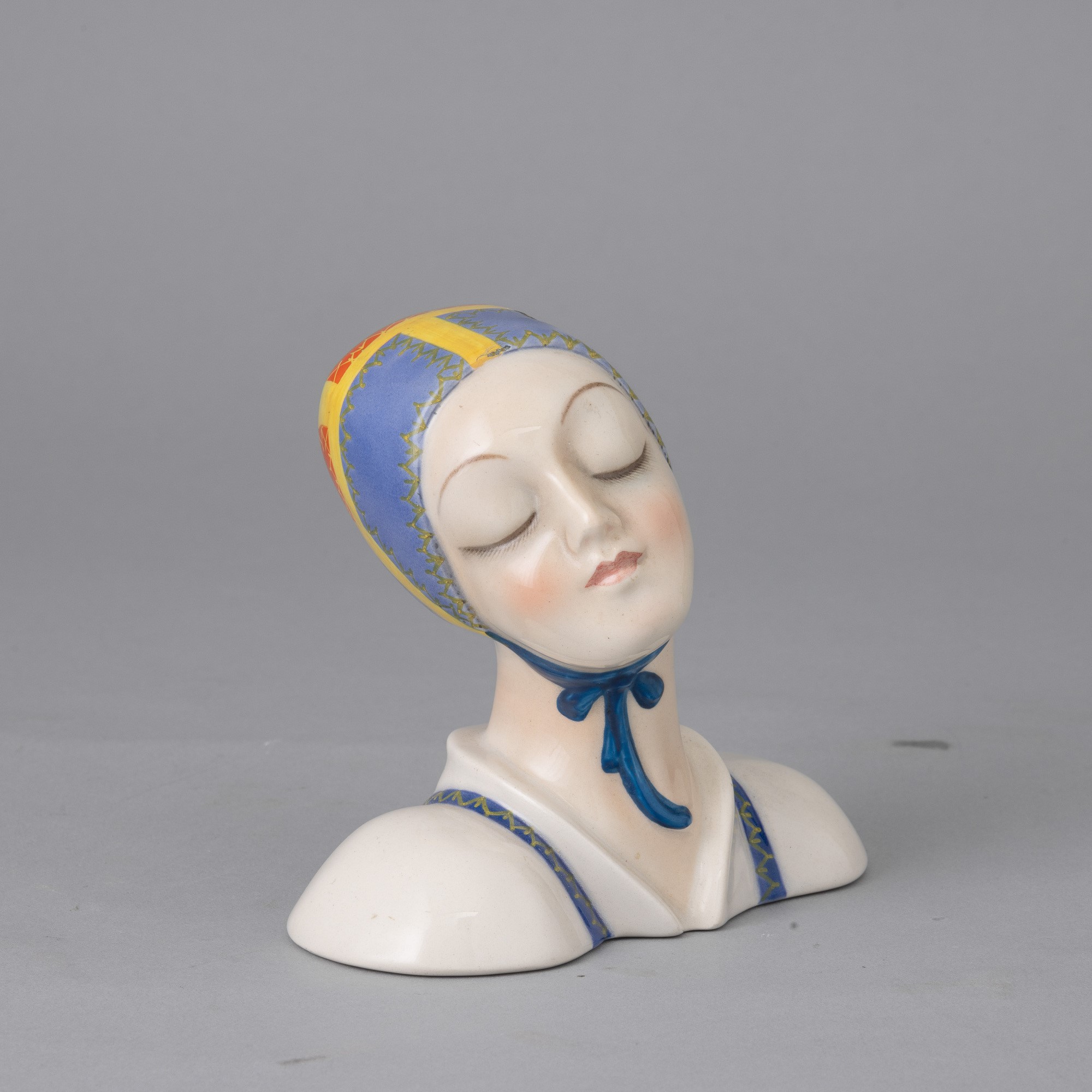 Testa di ragazza sarda in terraglia a colaggio con decoro policromo.