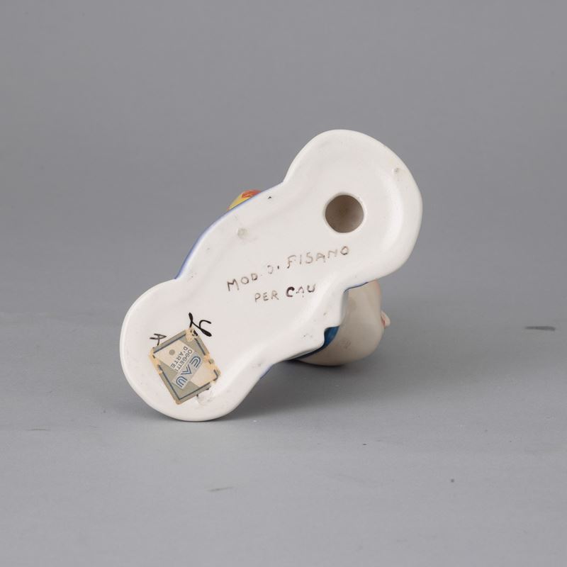 Marchio della manifattura, vecchia etichetta CAU Oggetti d'Arte, firma dell'autore.
