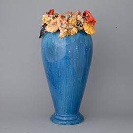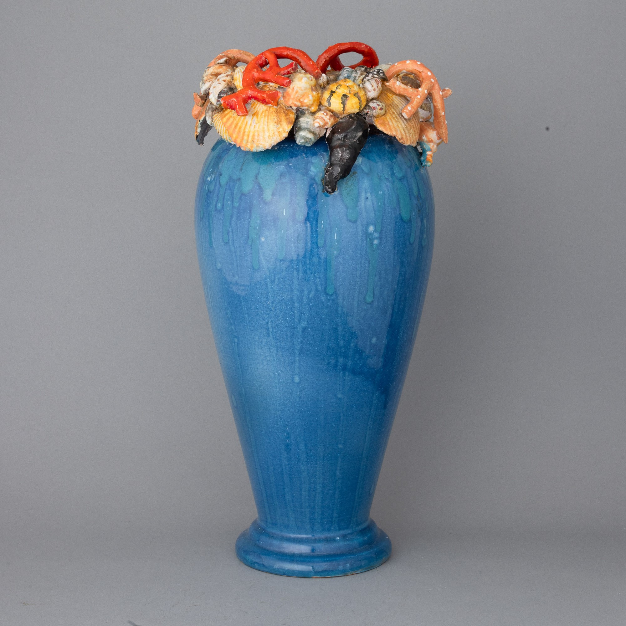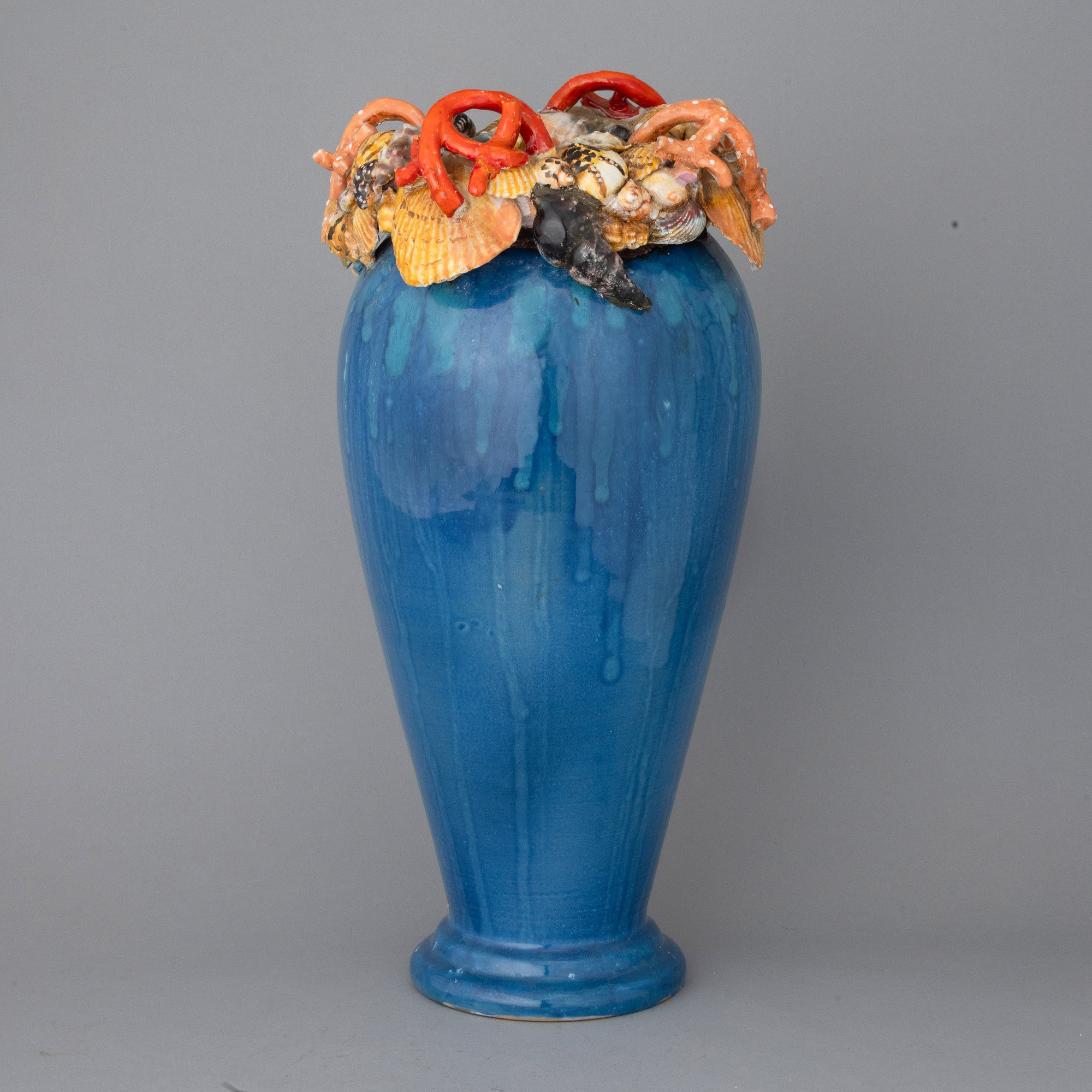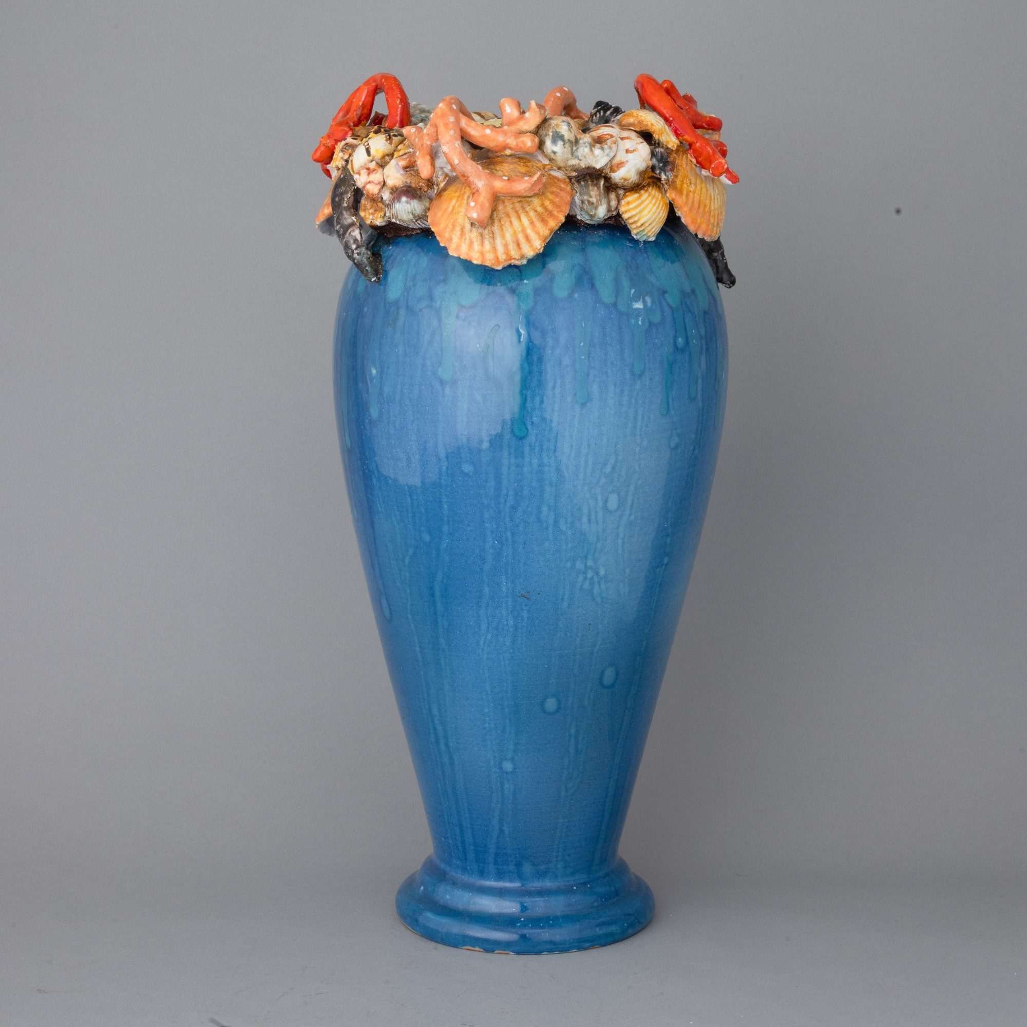 Grande vaso a balaustro in terracotta maiolicata blu con collo decorato da sculture di coralli e conchiglie a smalti policromi.