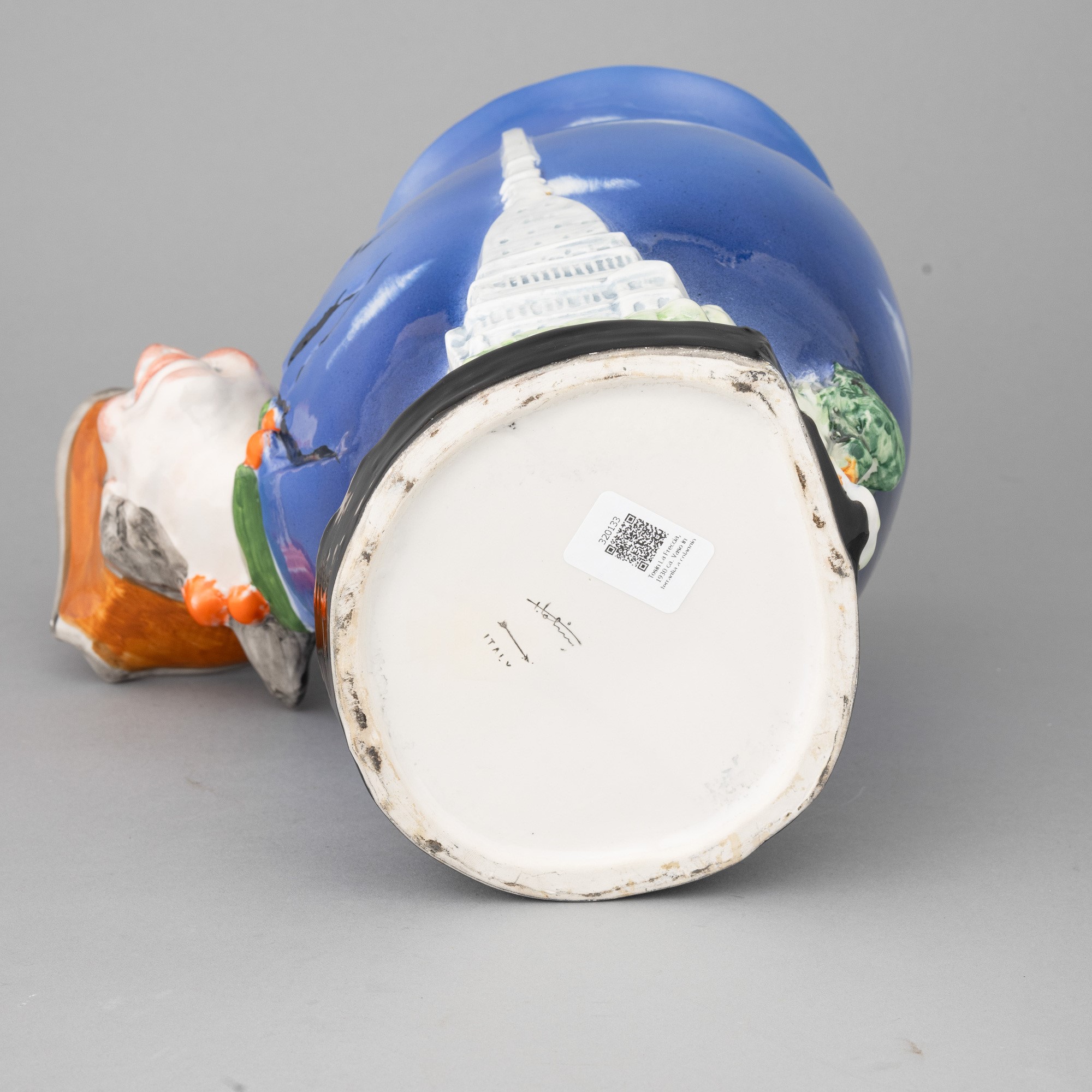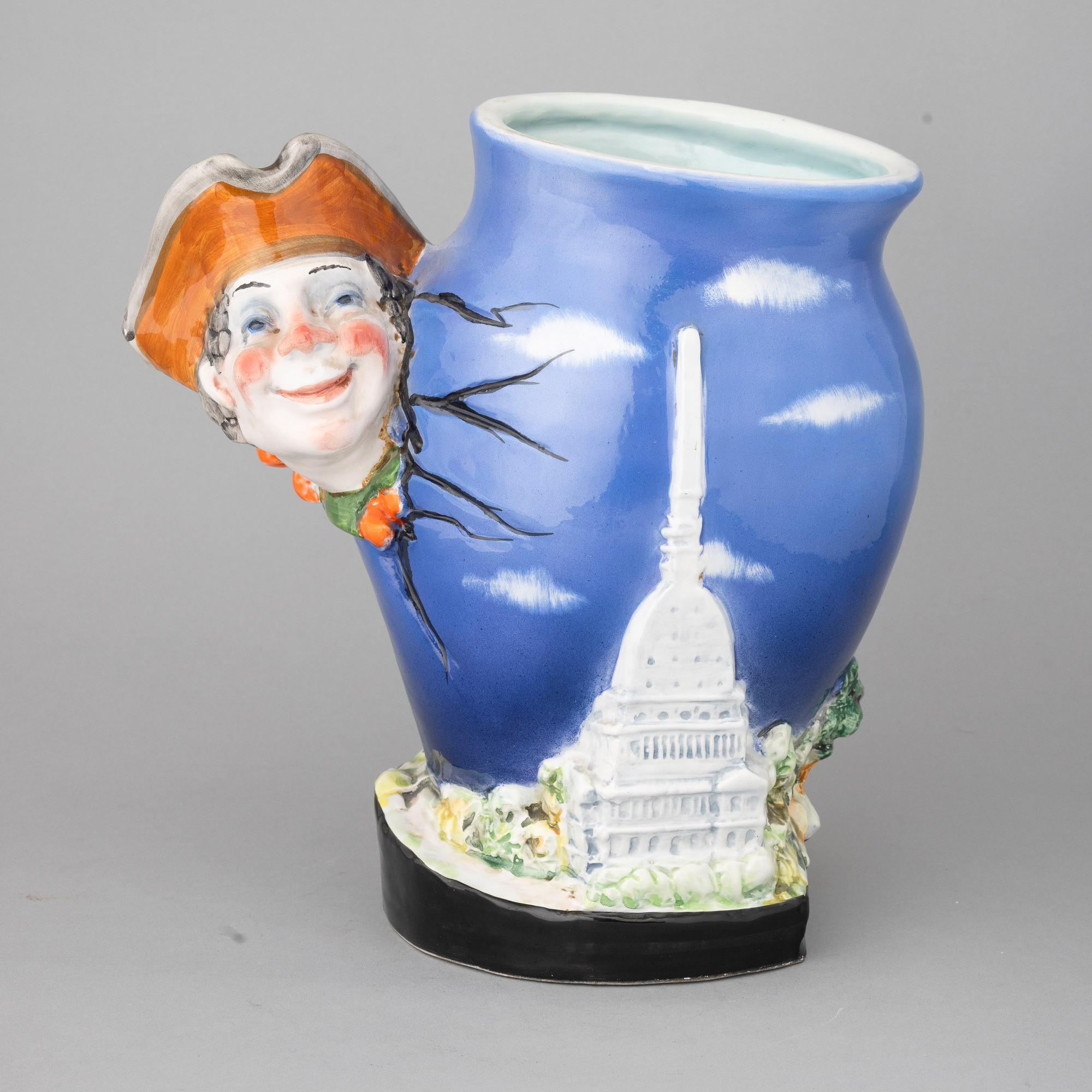 Vaso in terraglia a colaggio con decoro a rilievo della Mole Antonelliana e testa a tutto tondo di Gianduia a smalti policromi.