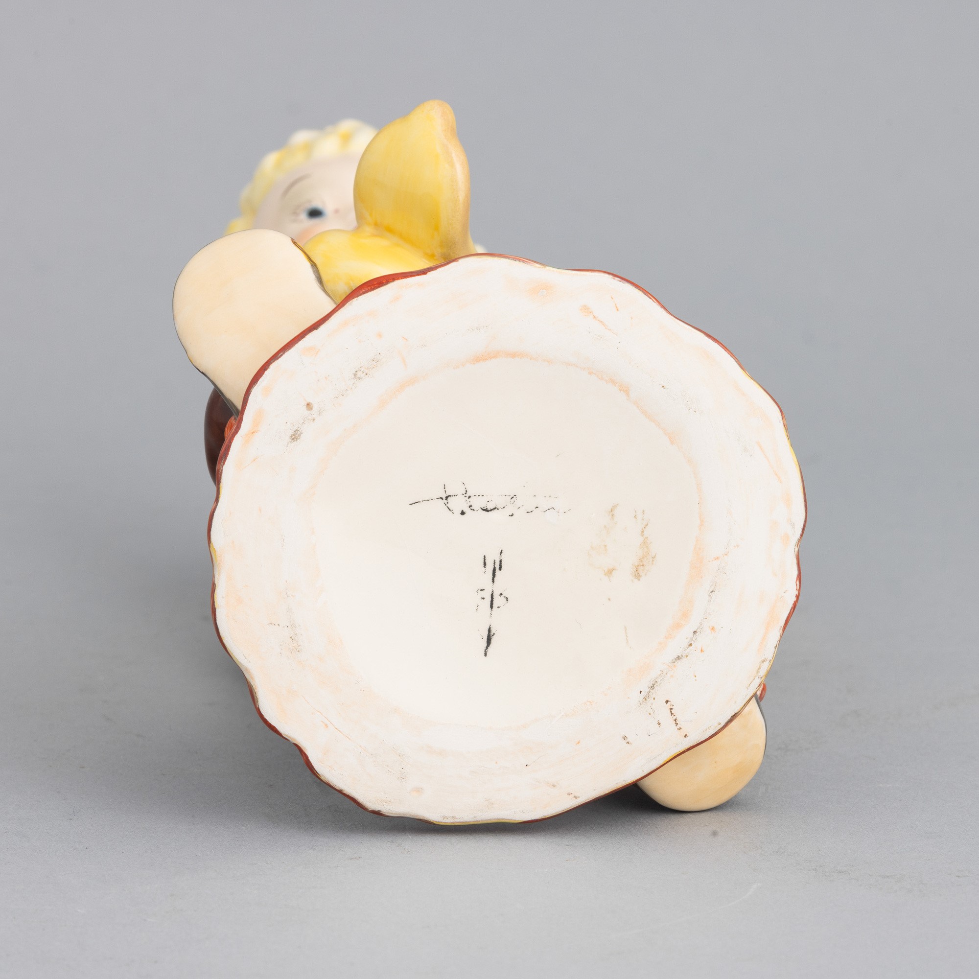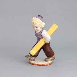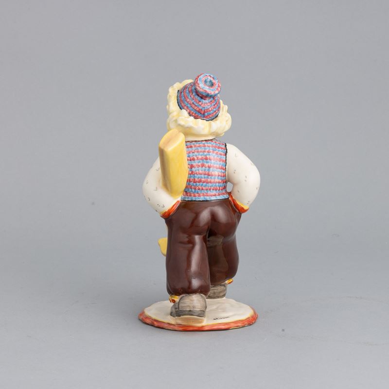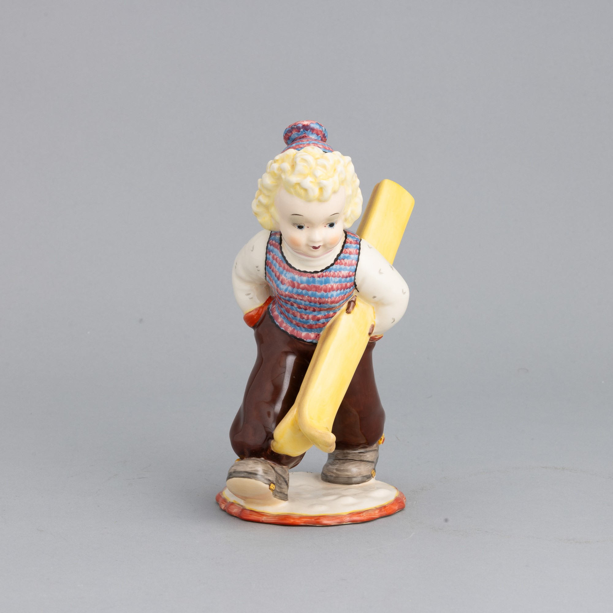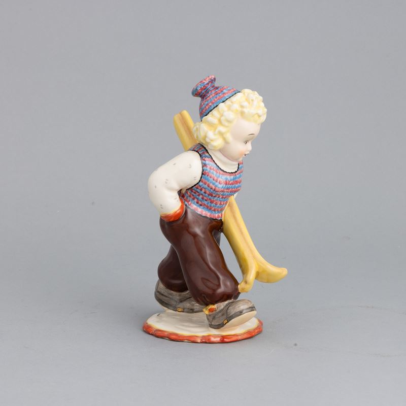 Figura di giovane sciatrice con gilet a righe in terraglia a colaggio con decoro policromo.