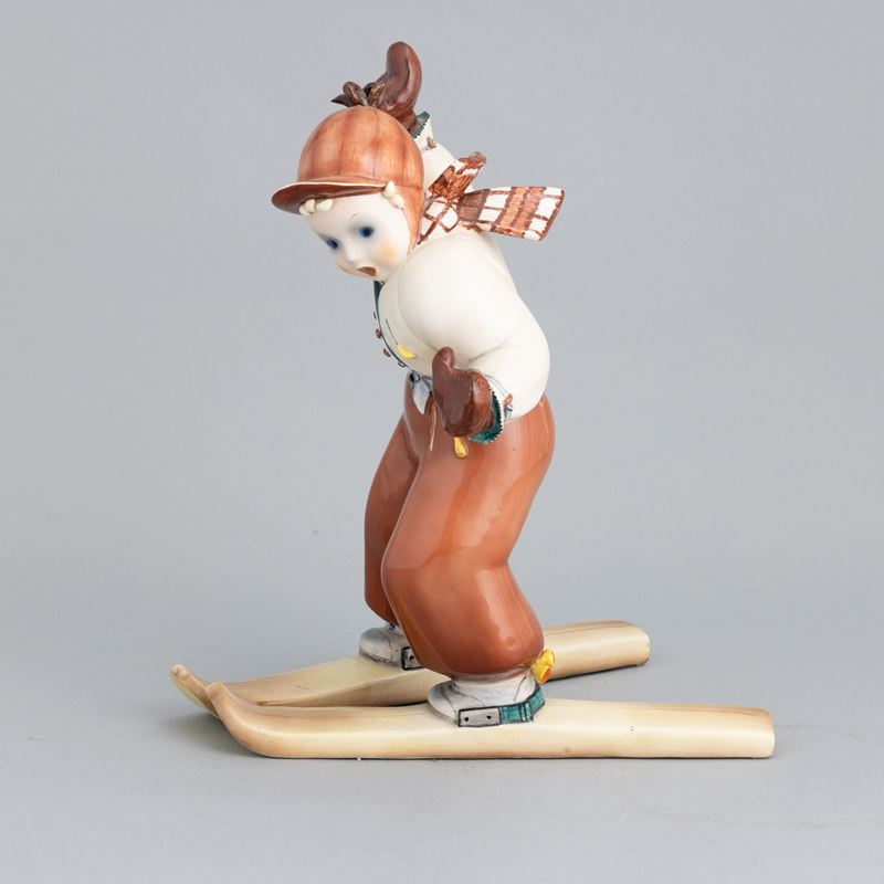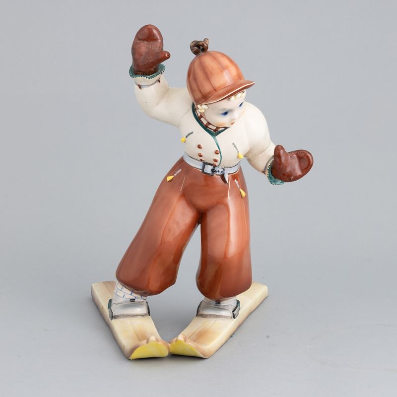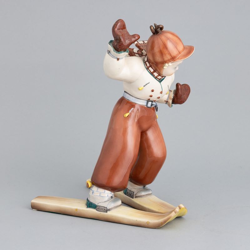 Figura di giovane sciatore con sciarpa al vento e cappellino con visiera in terraglia a colaggio con decoro policromo.