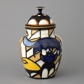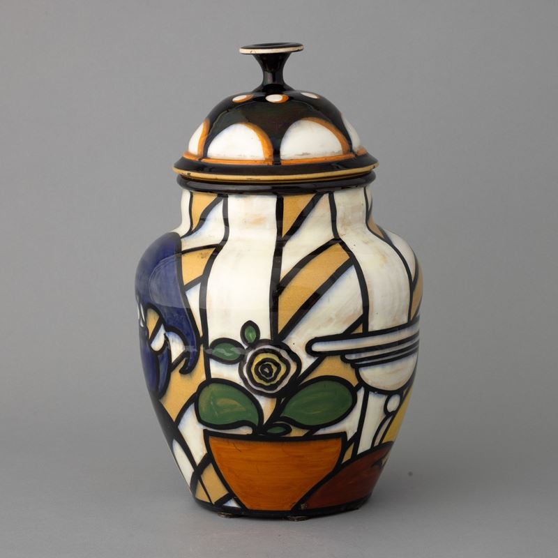 Potiche con coperchio in maiolica con decoro policromo di figure femminili in un interno.