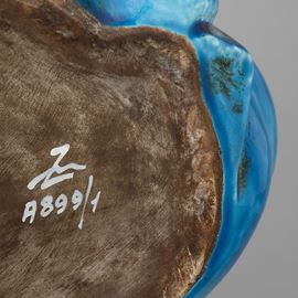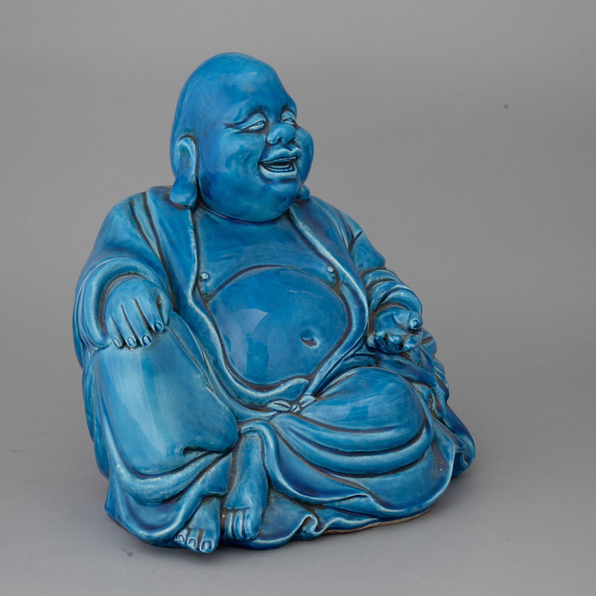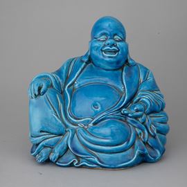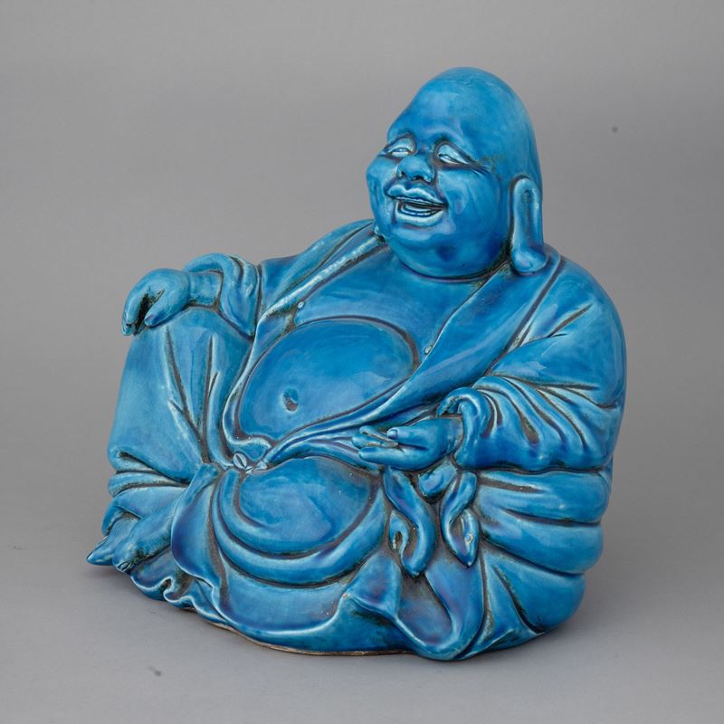 Grande figura di Buddha seduto in terraglia a colaggio con decoro di smalto turchese.