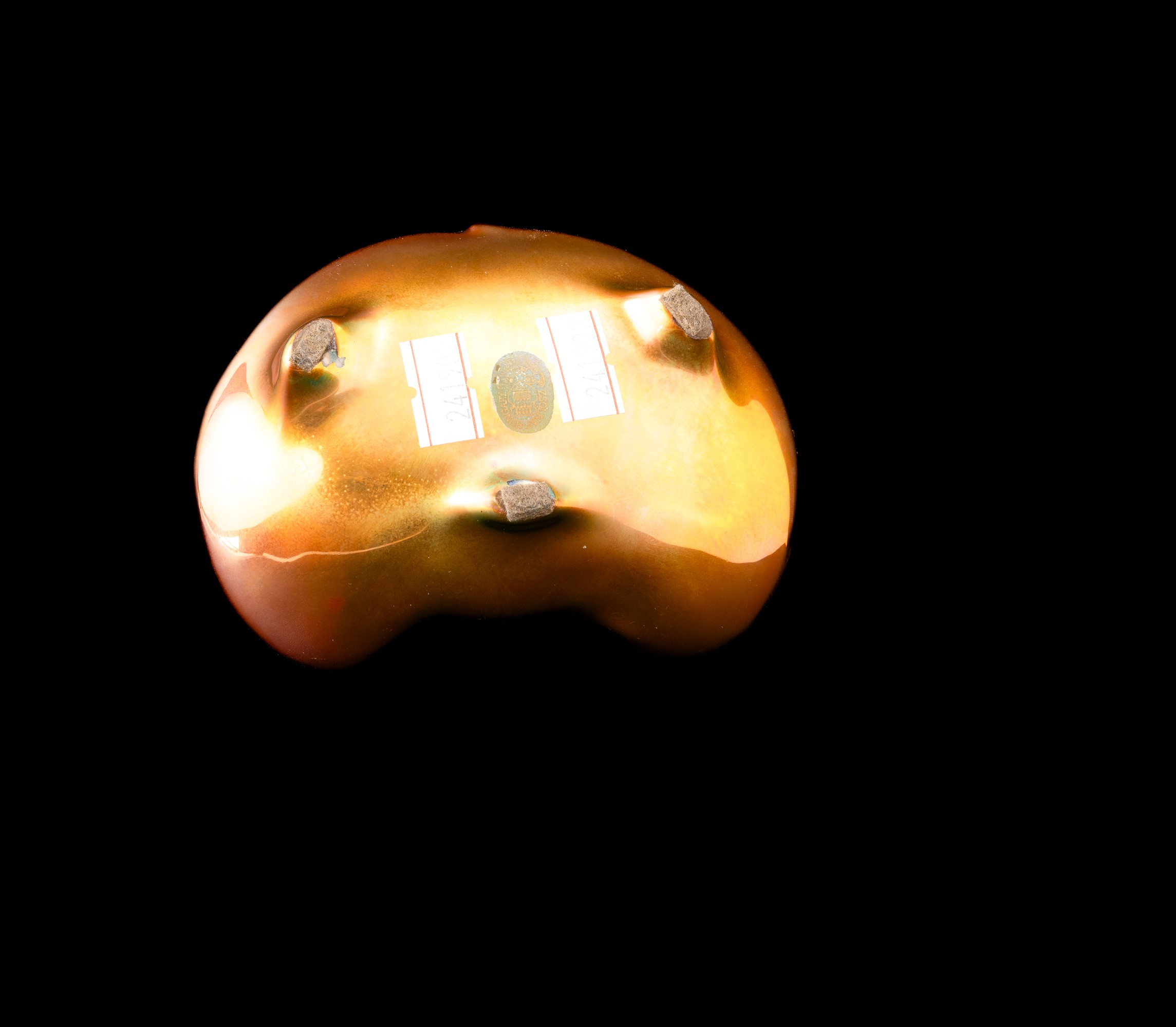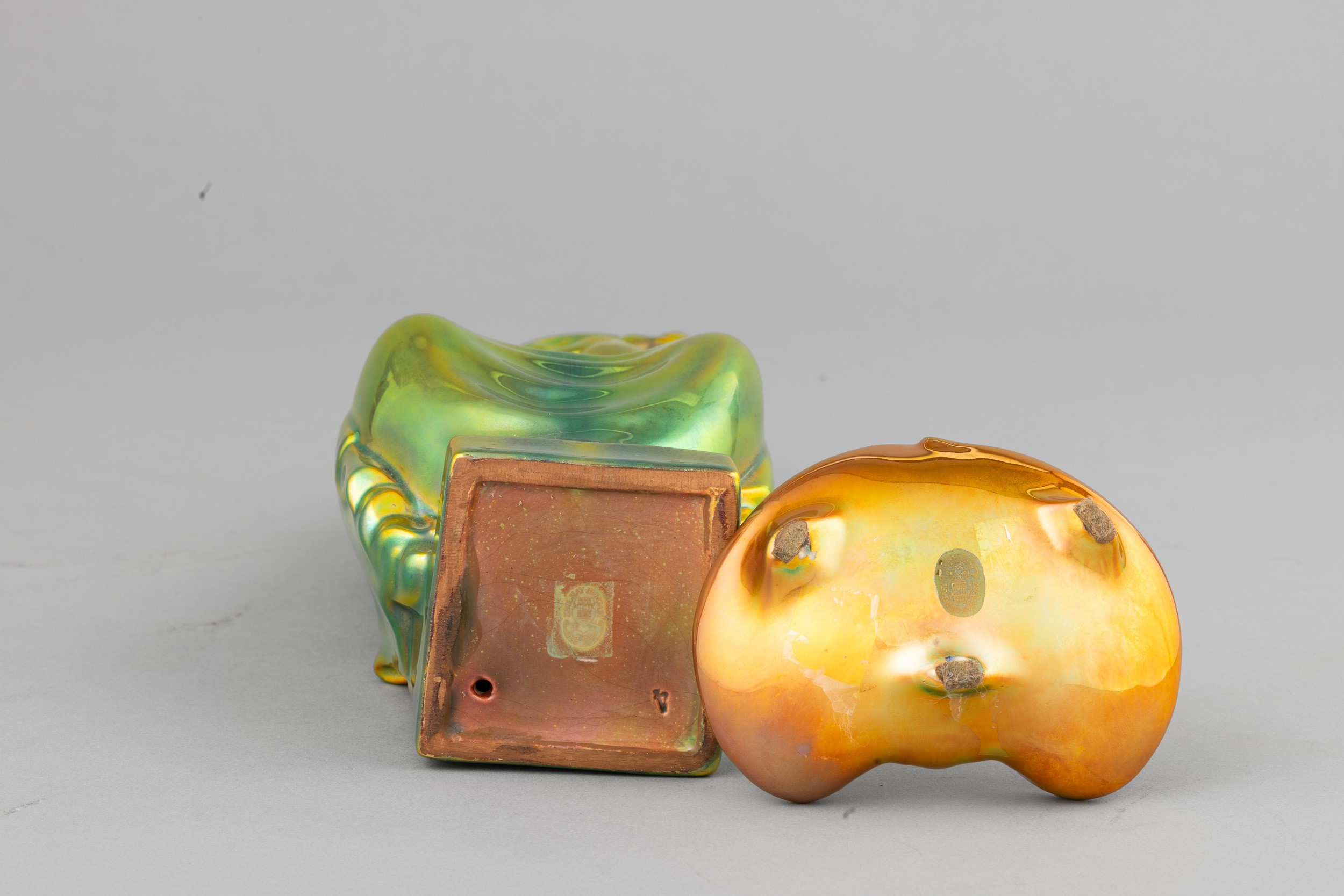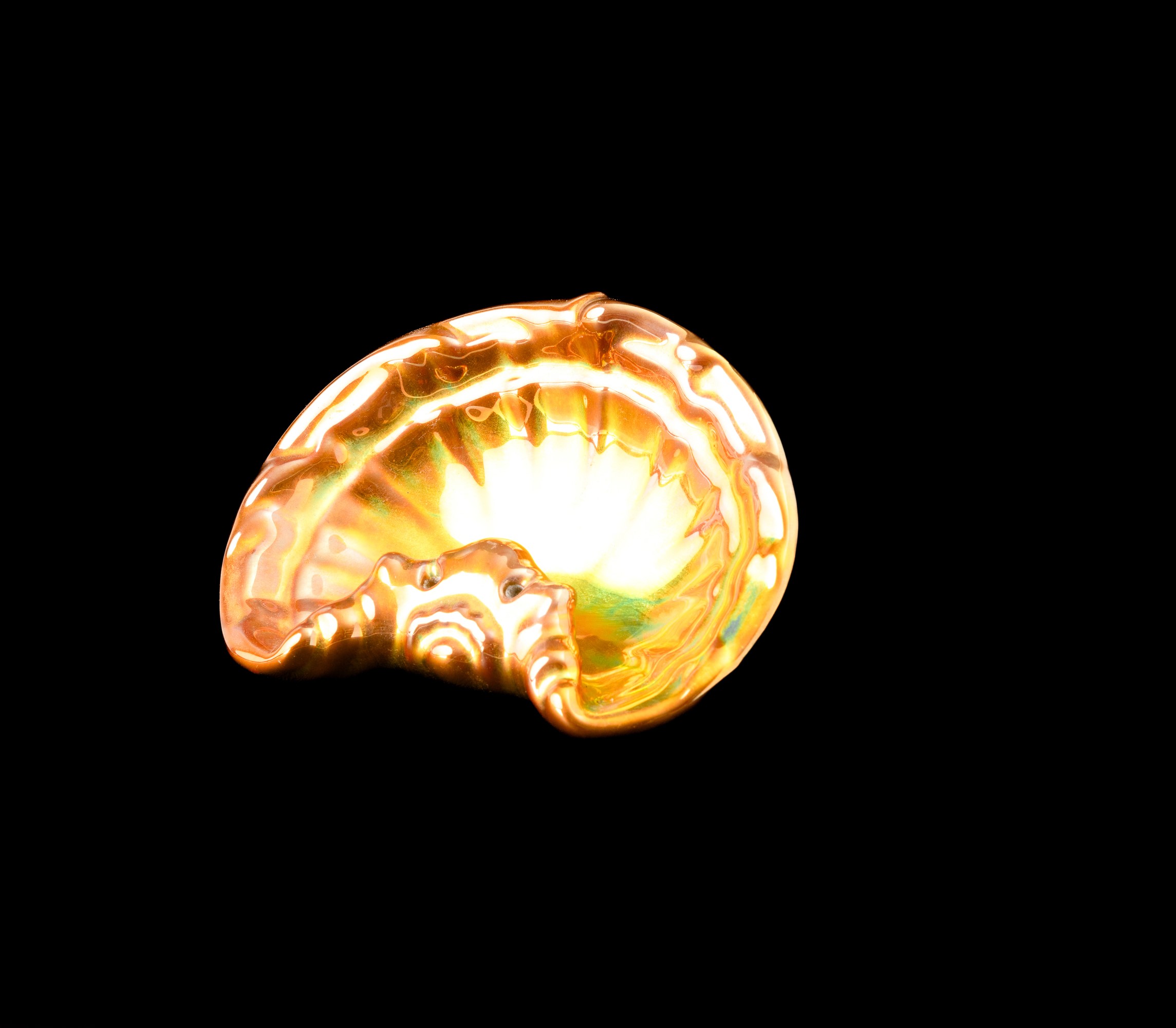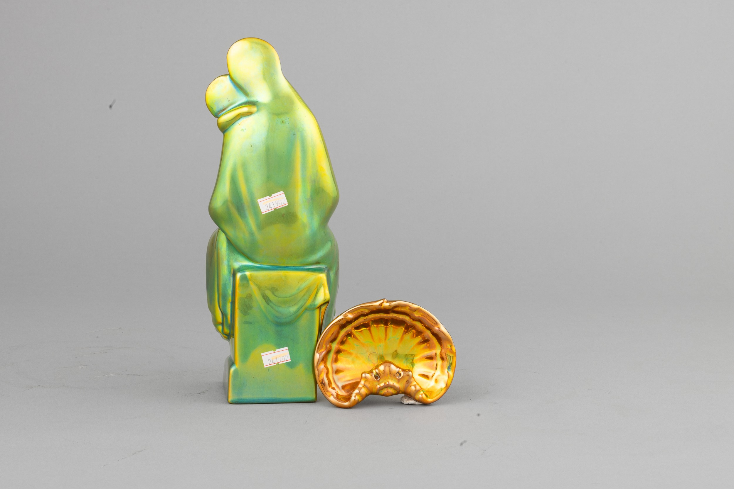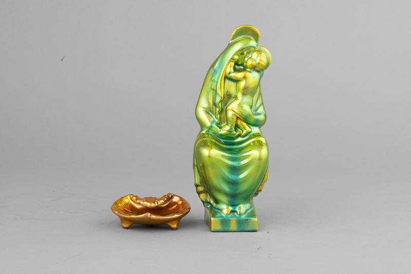 Lotto composto da due soprammobili in forma di Natività e conchiglia in terraglia a colaggio interamente smaltati a lustro di eosina.