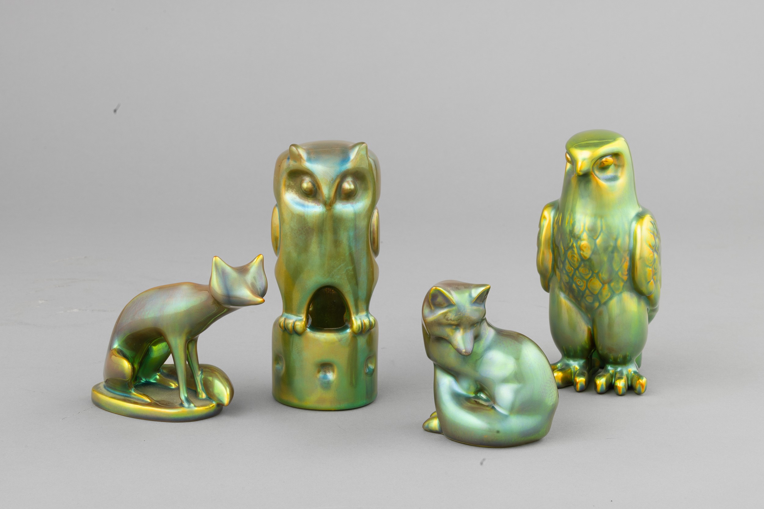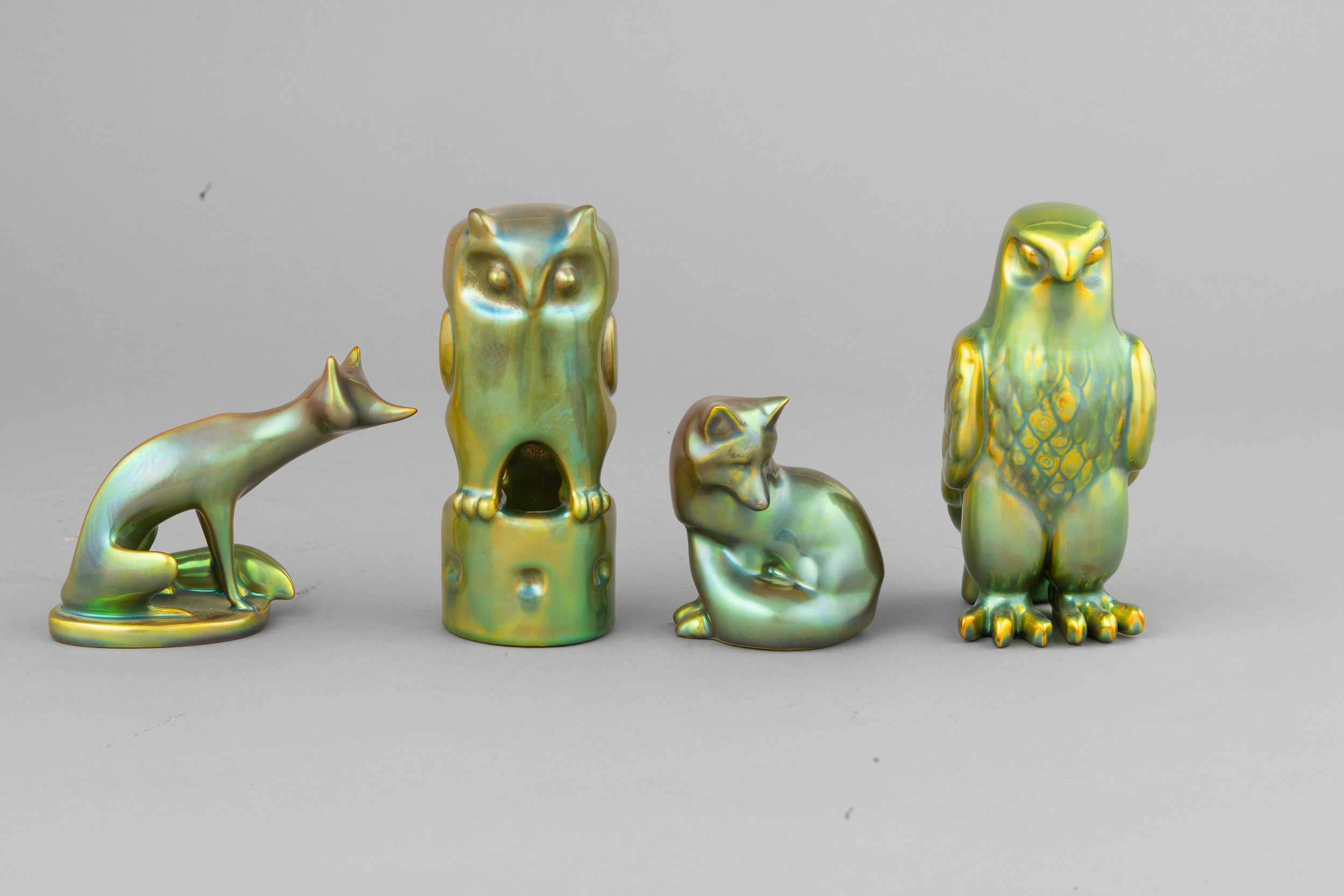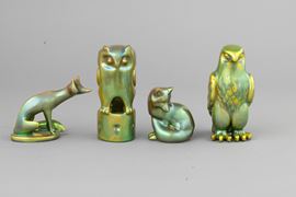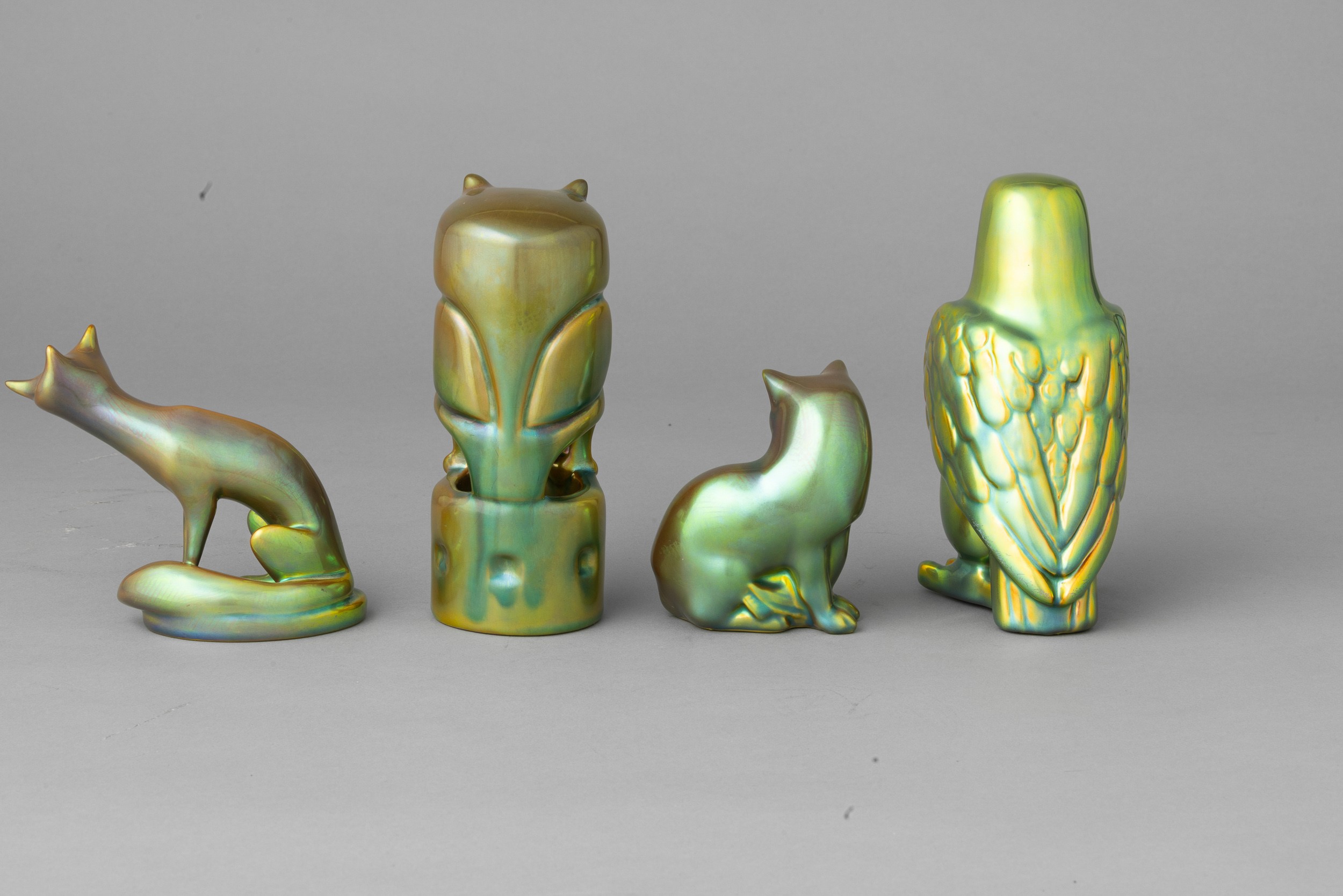 Lotto di quattro soprammobili in forma di animali in terraglia a colaggio interamente smaltati a lustro di eosina.