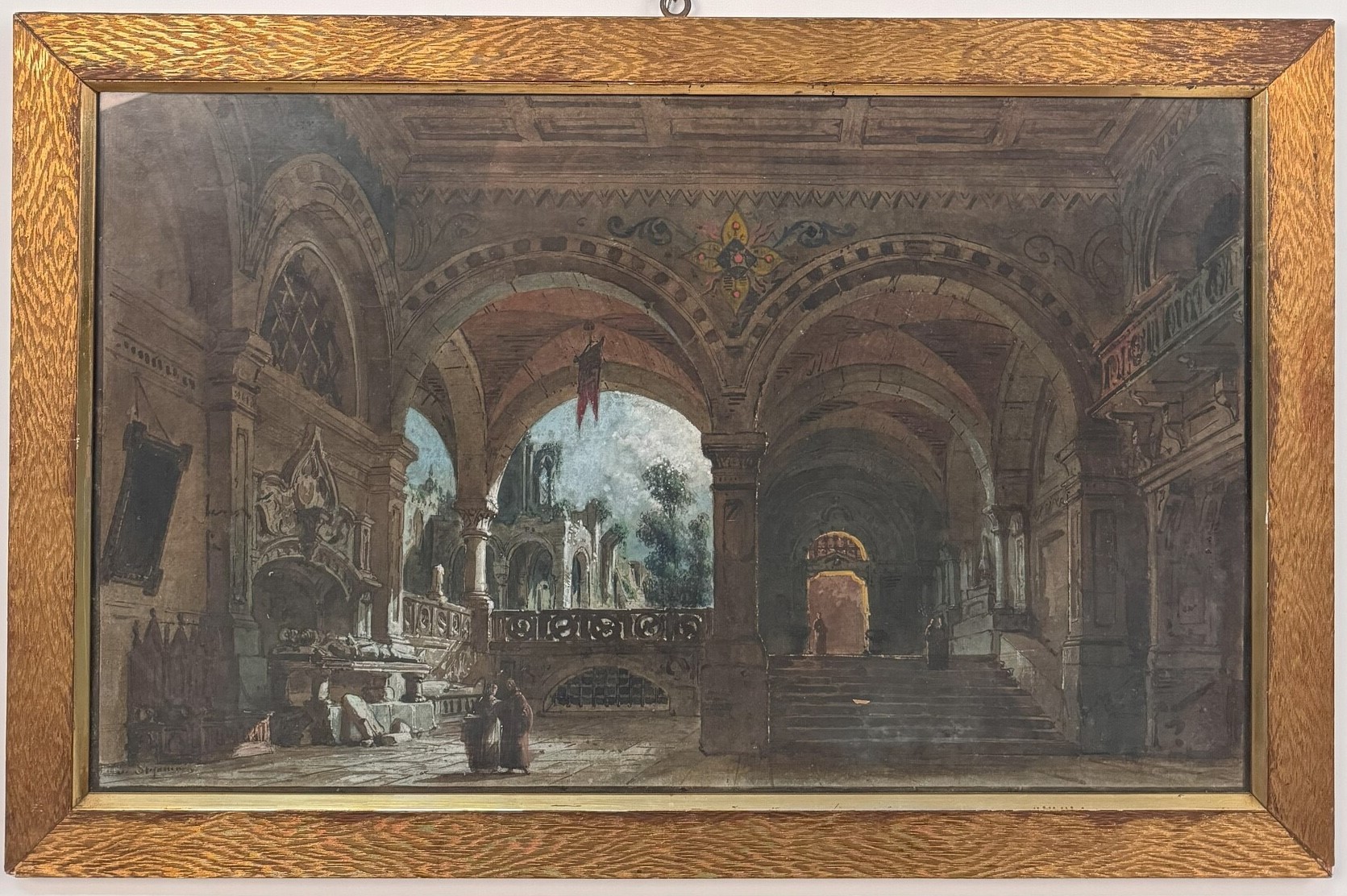 Anonimo del XIX secolo Interno di architettura neogotica con incontro tra un frate e una figura femminile