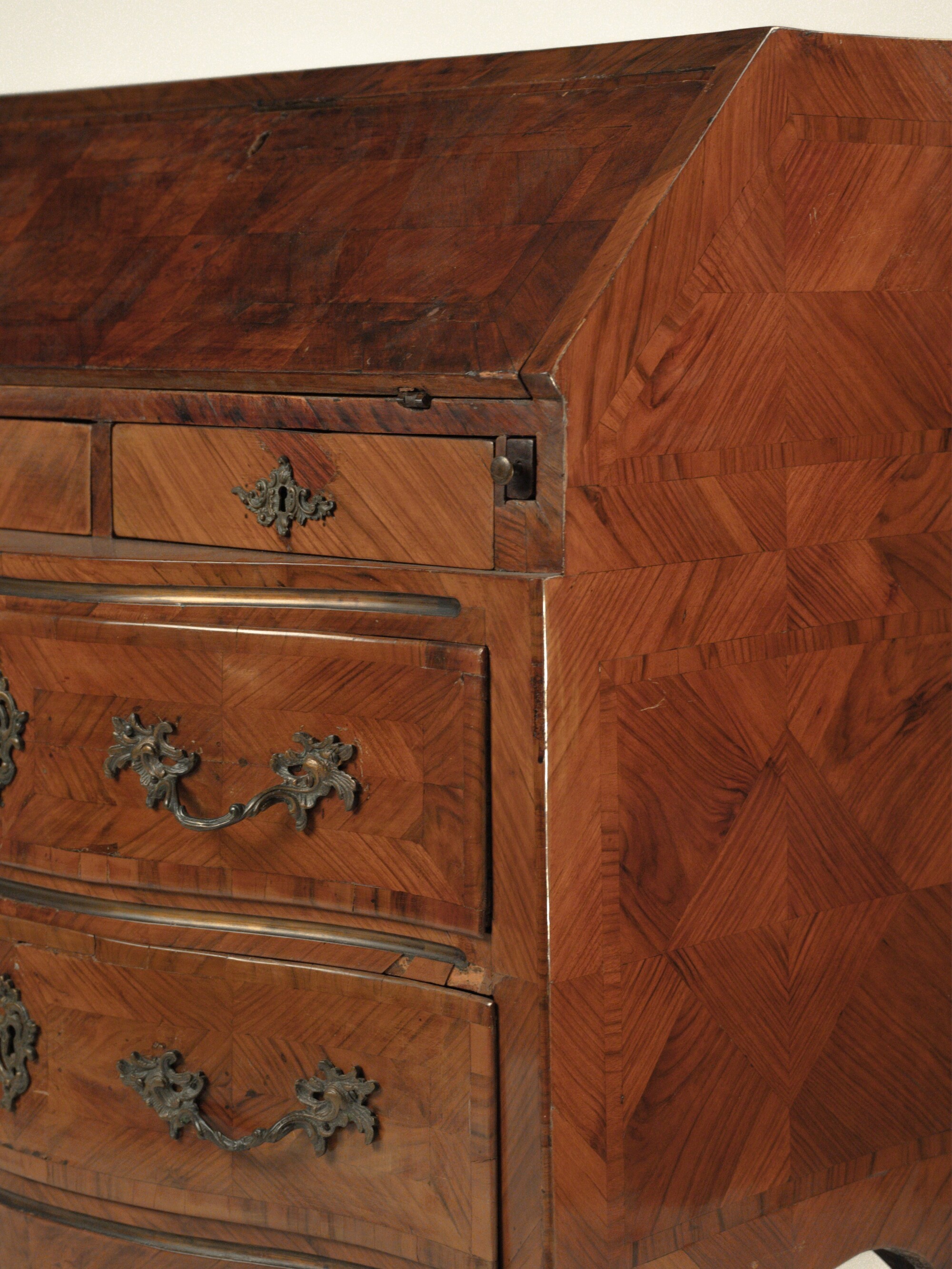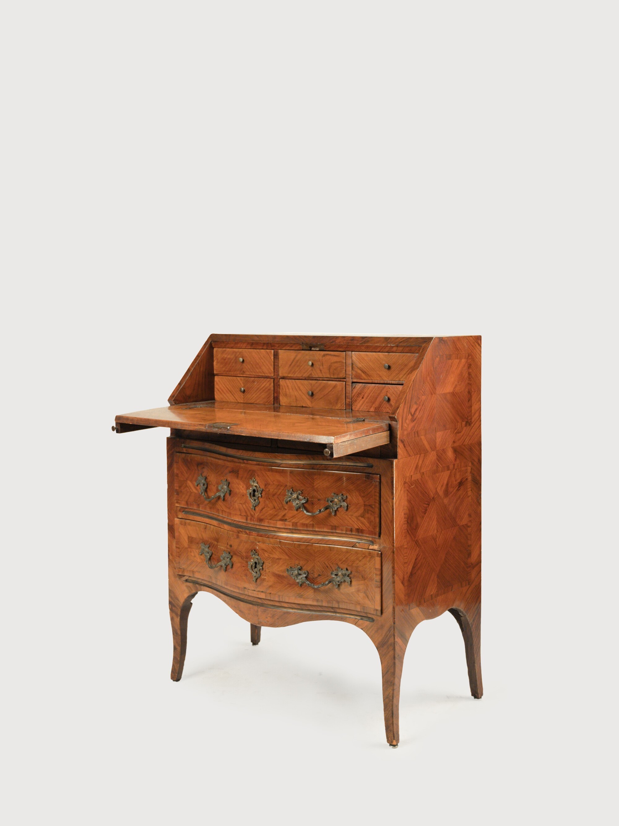 Fronte sagomato a due cassetti separati da traversa e sormontati da due più piccoli in linea, nella calatoia sei piccoli cassetti. Fianchi svasati, grembiale sagomato e gambe mosse.