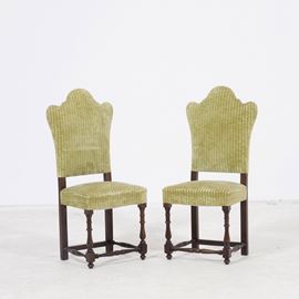 Gruppo di 14 sedie e tavolo in noce intagliato. XVIII secolo