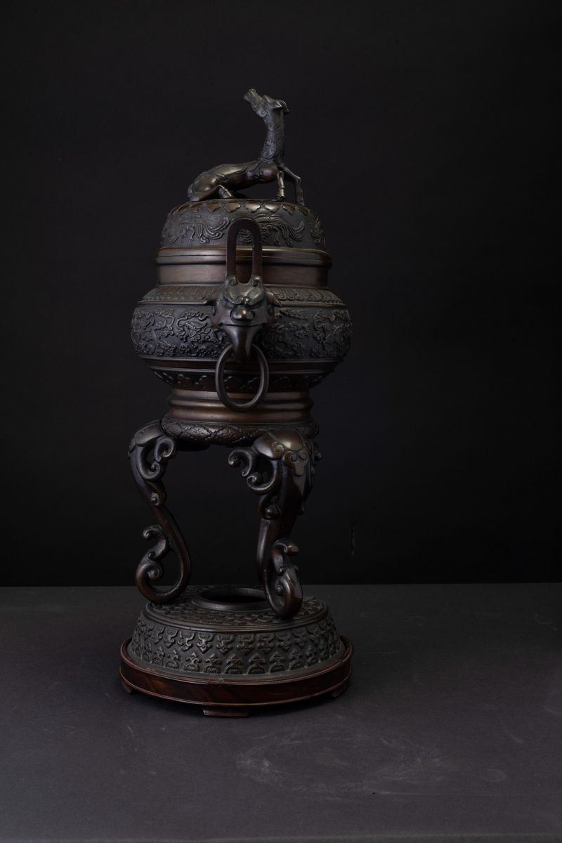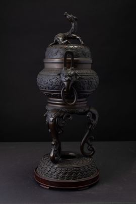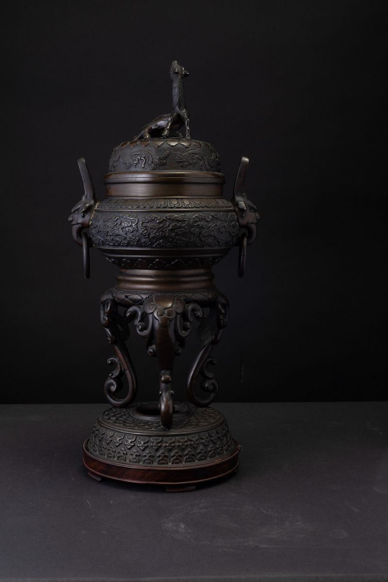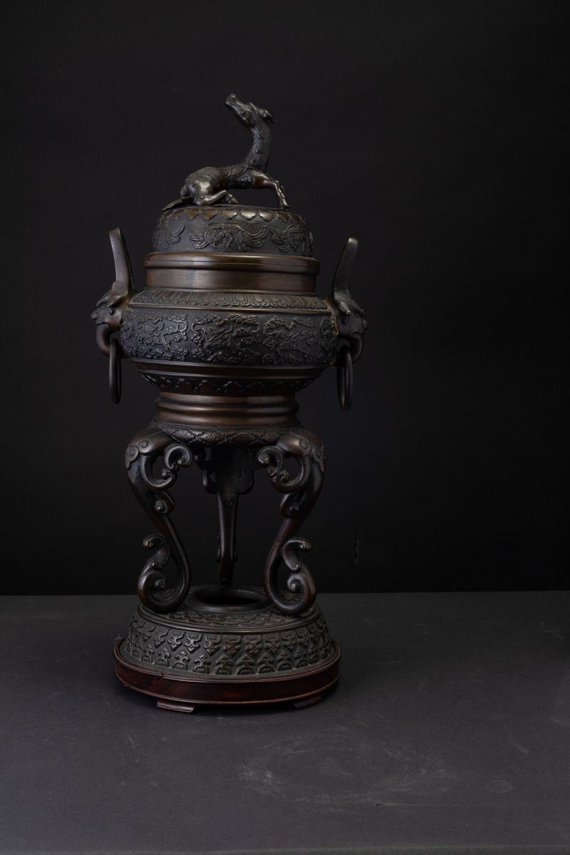 Incensiere tripode in bronzo con mascheroni, anse ad anelli, decori a rilievo e presa del coperchio a foggia di drago, Cina, Dinastia Qing, XIX secolo