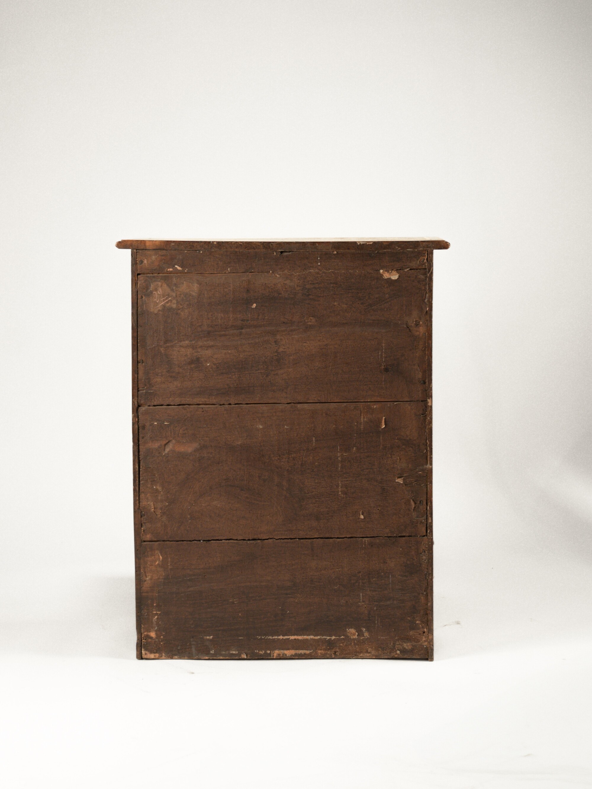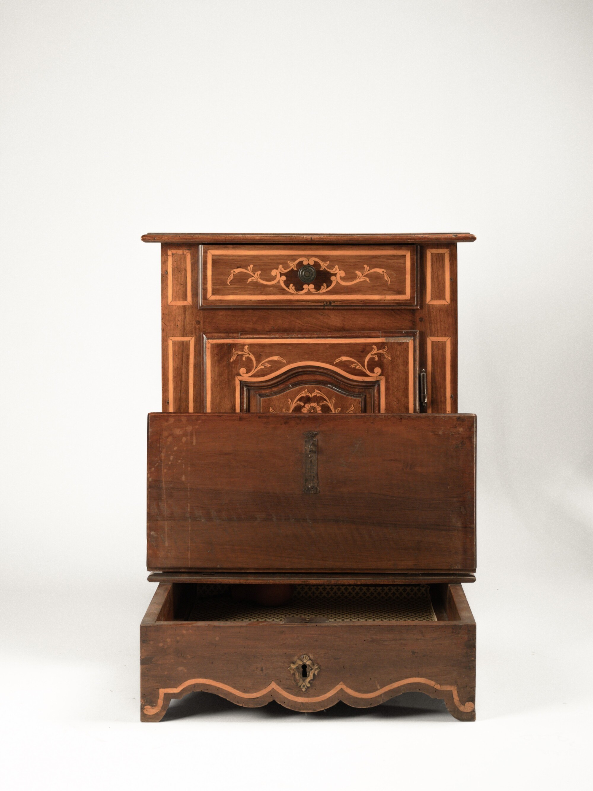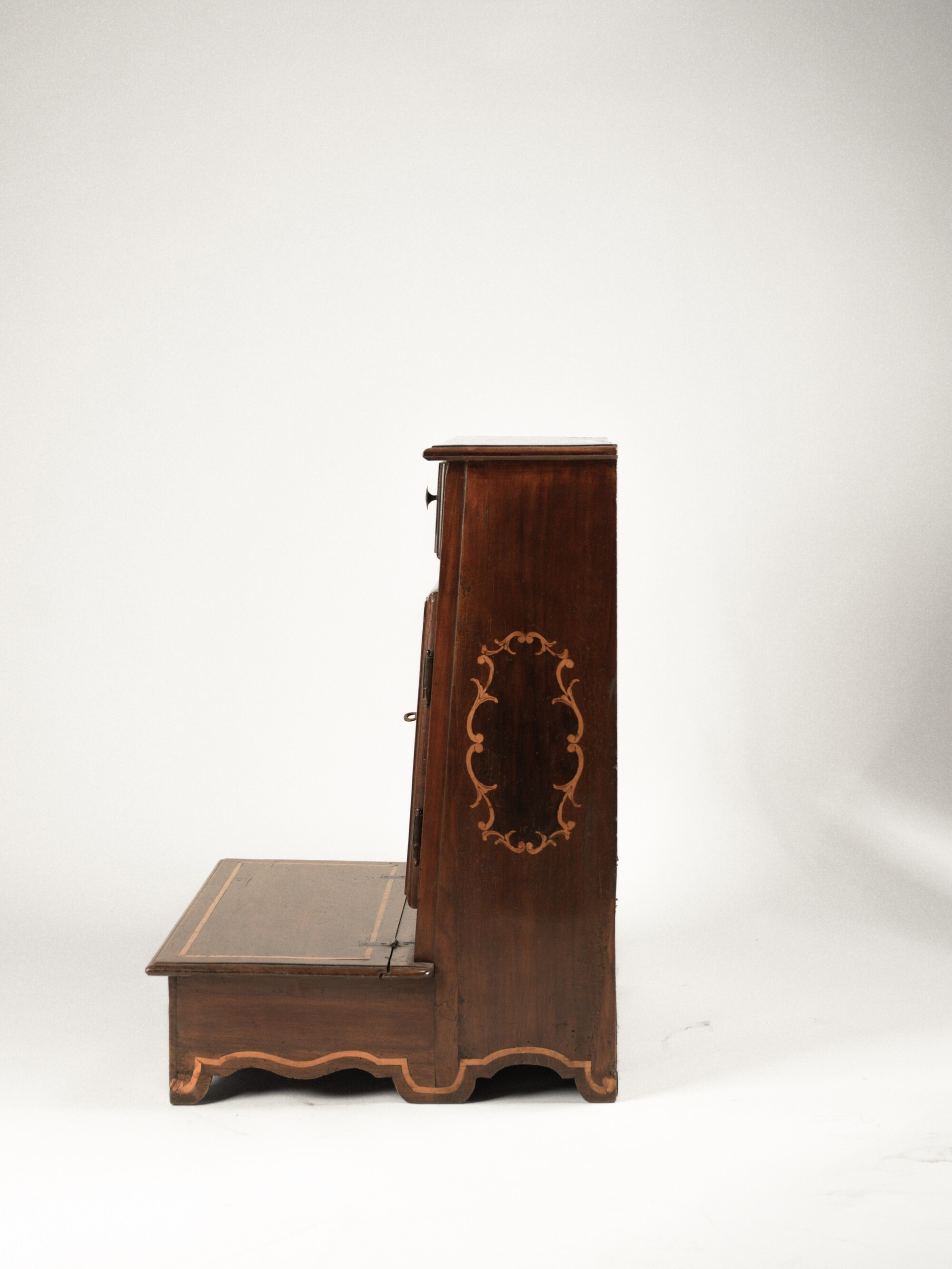 Fronte a un cassetto e un'anta. L'anta è decorata da un pannello scolpito e centrato da un decoro a vaso di fiori entro volute. Il piano, il cassetto e i fianchi presentano un decoro a cartiglio a volute, predella sollevabile, grembiale sagomato