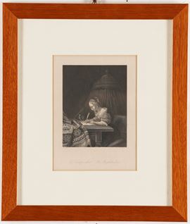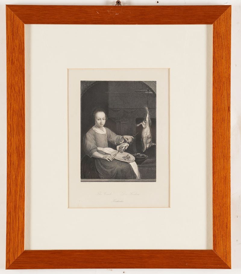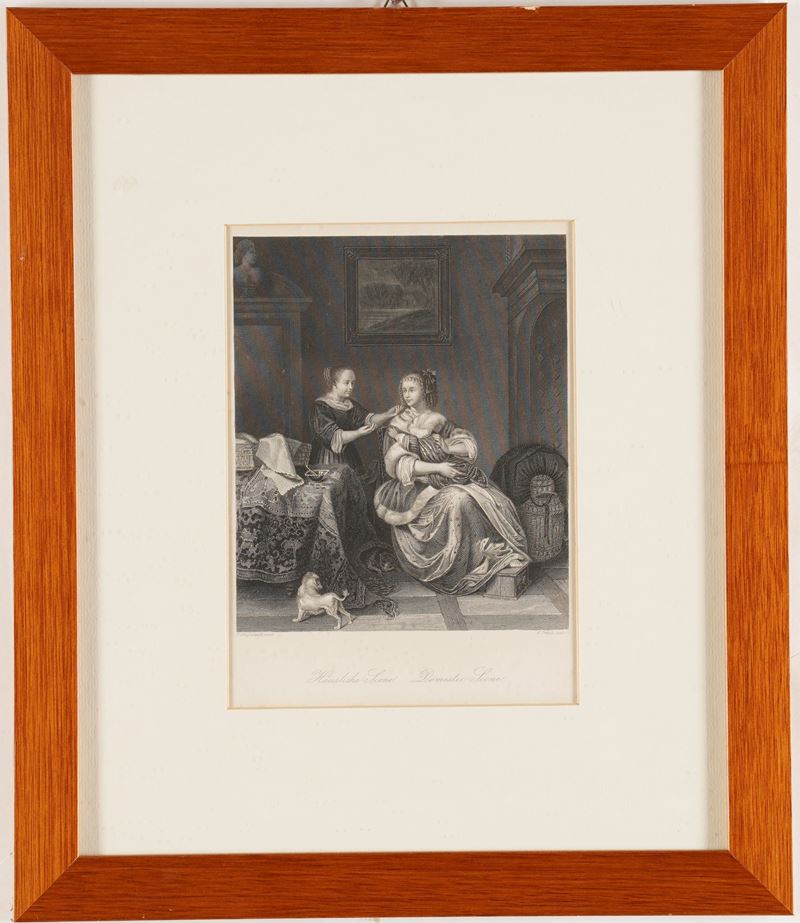 Lotto di tre incisioni tedesche con scene di interno, XIX secolo