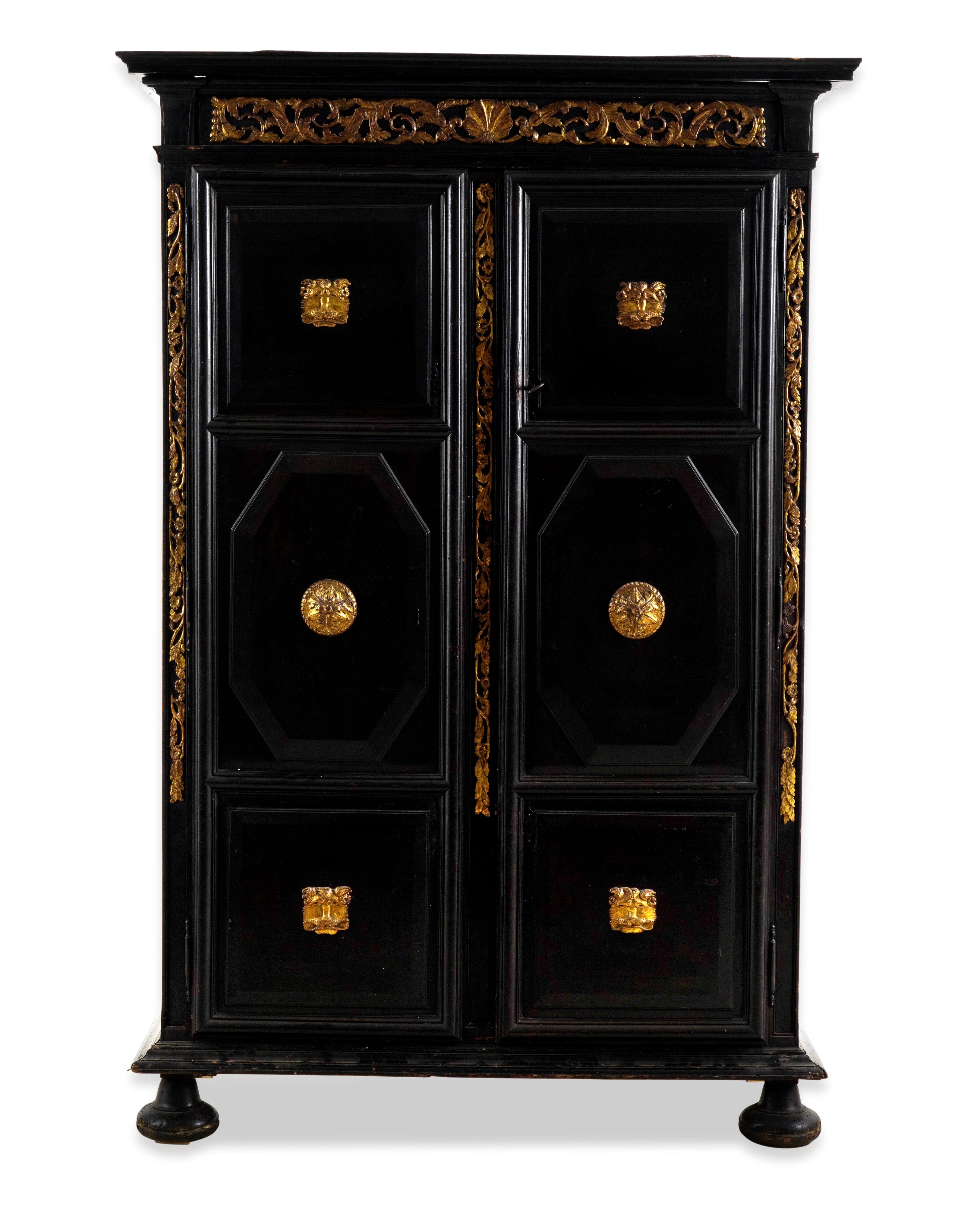 Legno ebanizzato, decoro dorato a rilievo con girali vegetali, conchiglie e mascheroni