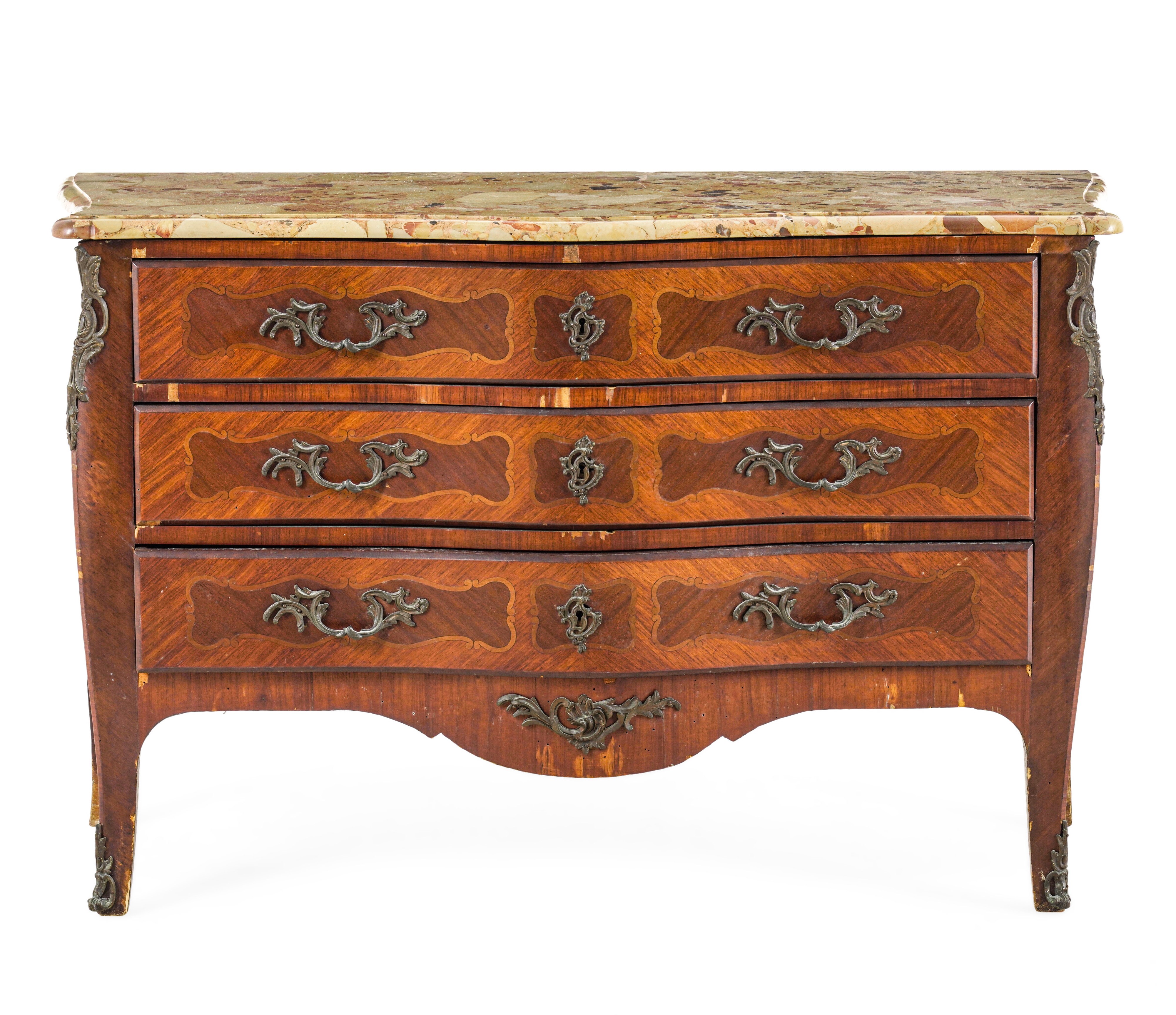 Fronte mosso a tre cassetti, piano in breccia di forma sagomata, applicazioni decorative in bronzo