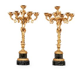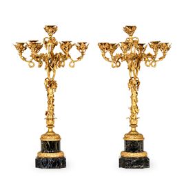 Coppia di candelabri a sette luci in bronzo dorato su basi in marmo nero. XX secolo