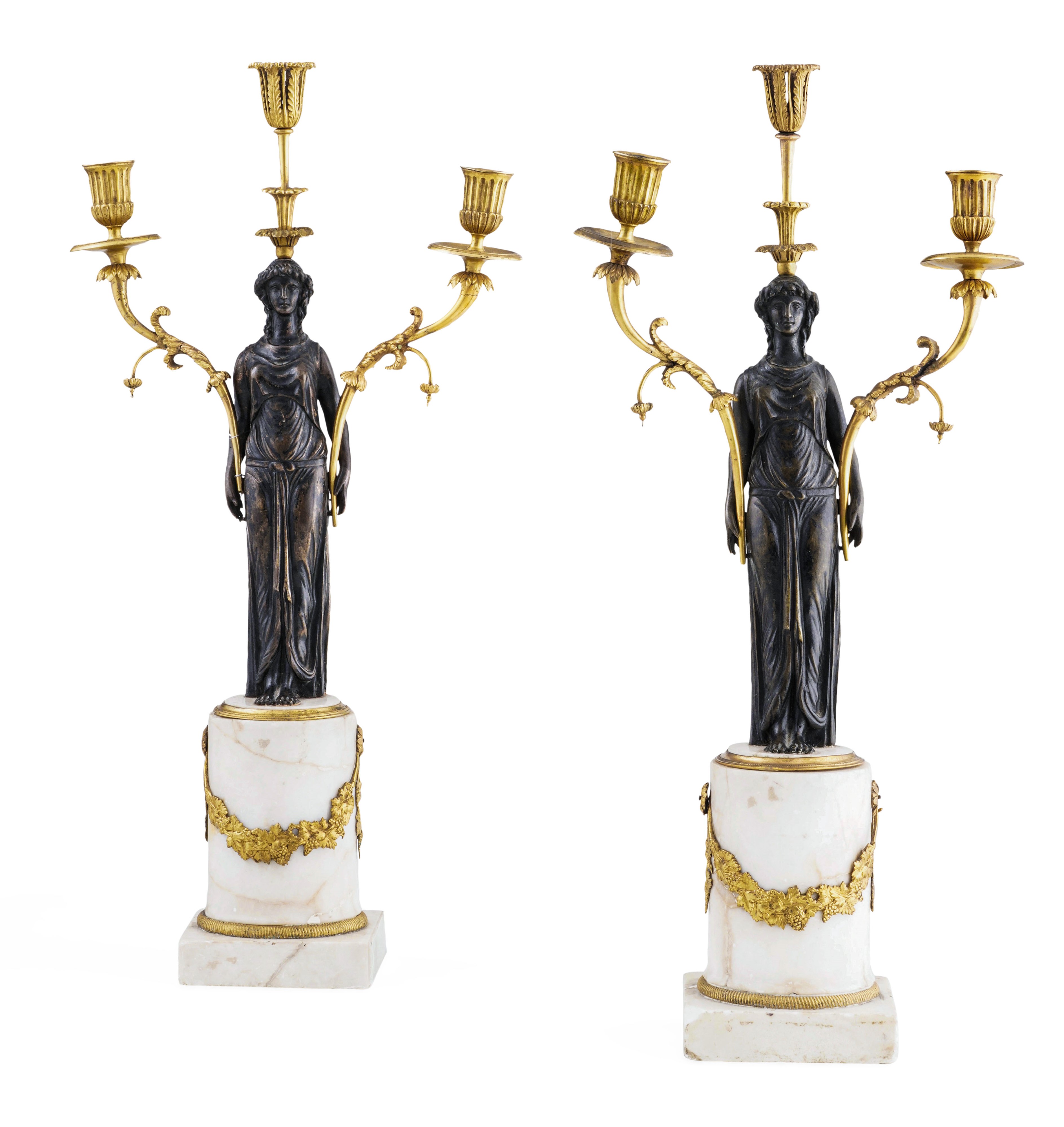 Coppia di candelabri neoclassici in bronzo patinato e dorato. Probabilmente Roma XIX secolo
