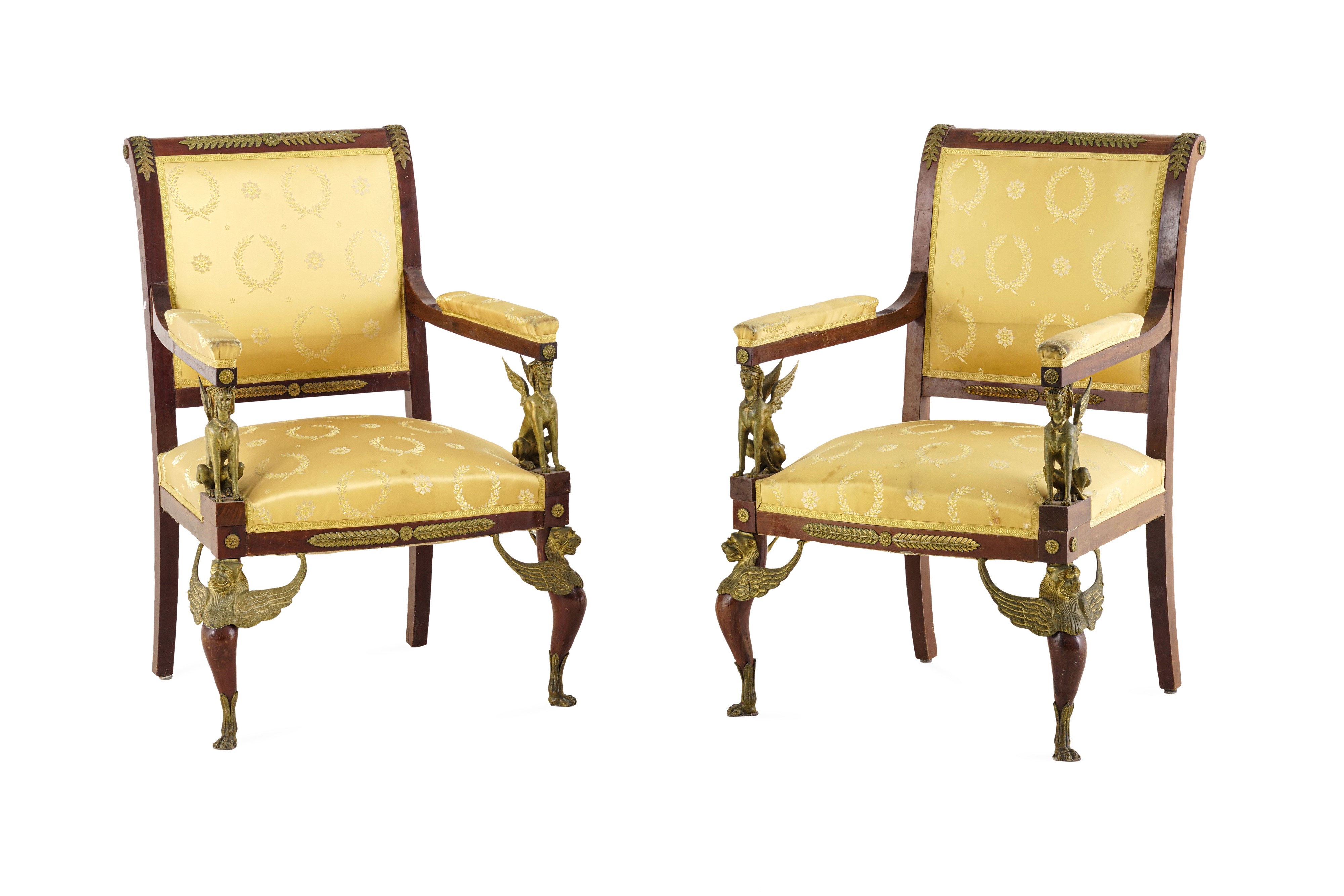 Schienale rettangolare lievemente estroflesso verso l'esterno ornato da motivi fogliacei, braccioli imbottiti su sostegni in bronzo dorato a foggia di sfingi a tutto tondo, due figure alate con piedi ferini in bronzo dorato formano le due gambe anteriori, seduta e schienale imbottiti