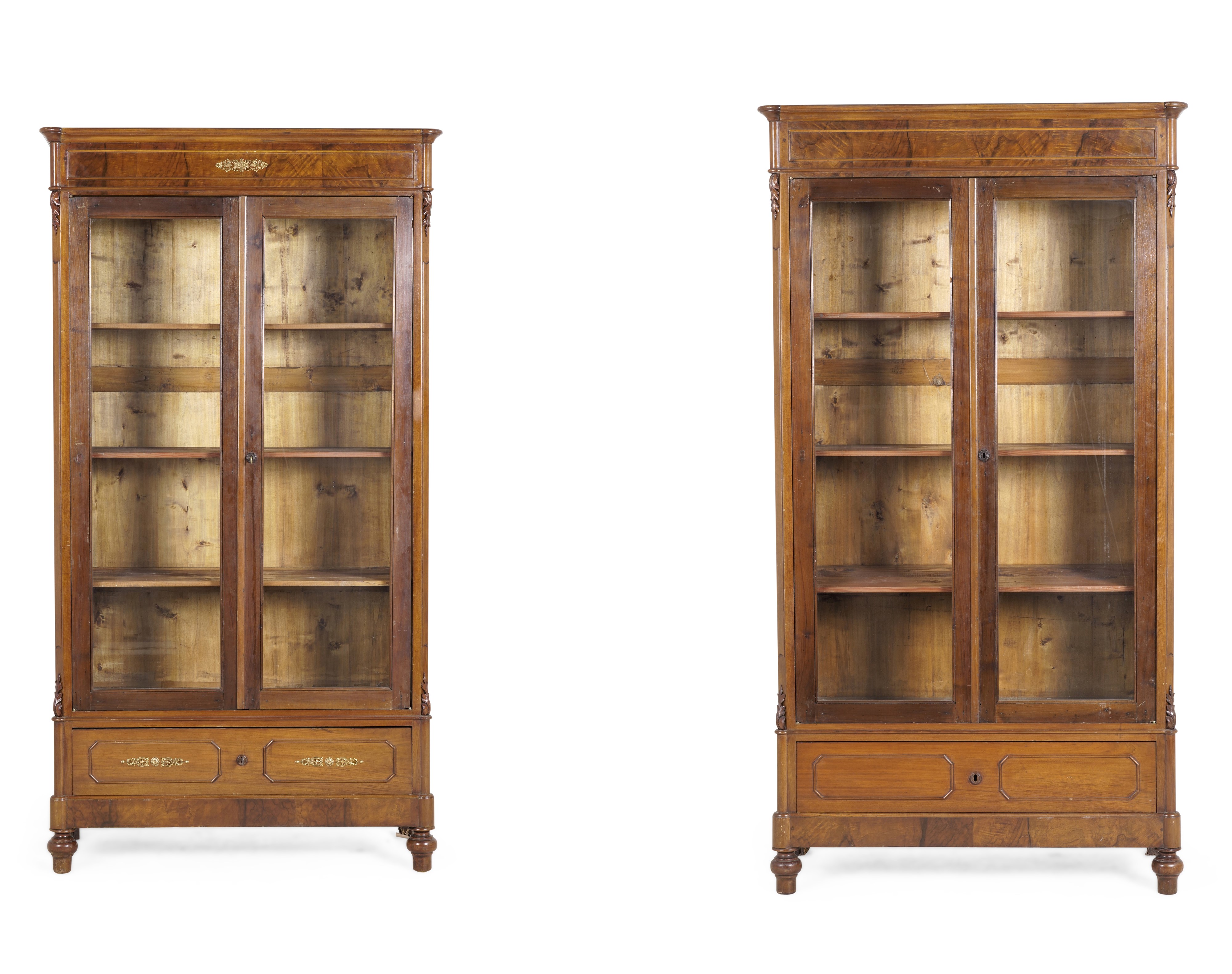 A due ante, con cassetto alla base, montanti arricchiti da foglie d'acanto intagliate. Una con applicazioni decorative in bronzo dorato