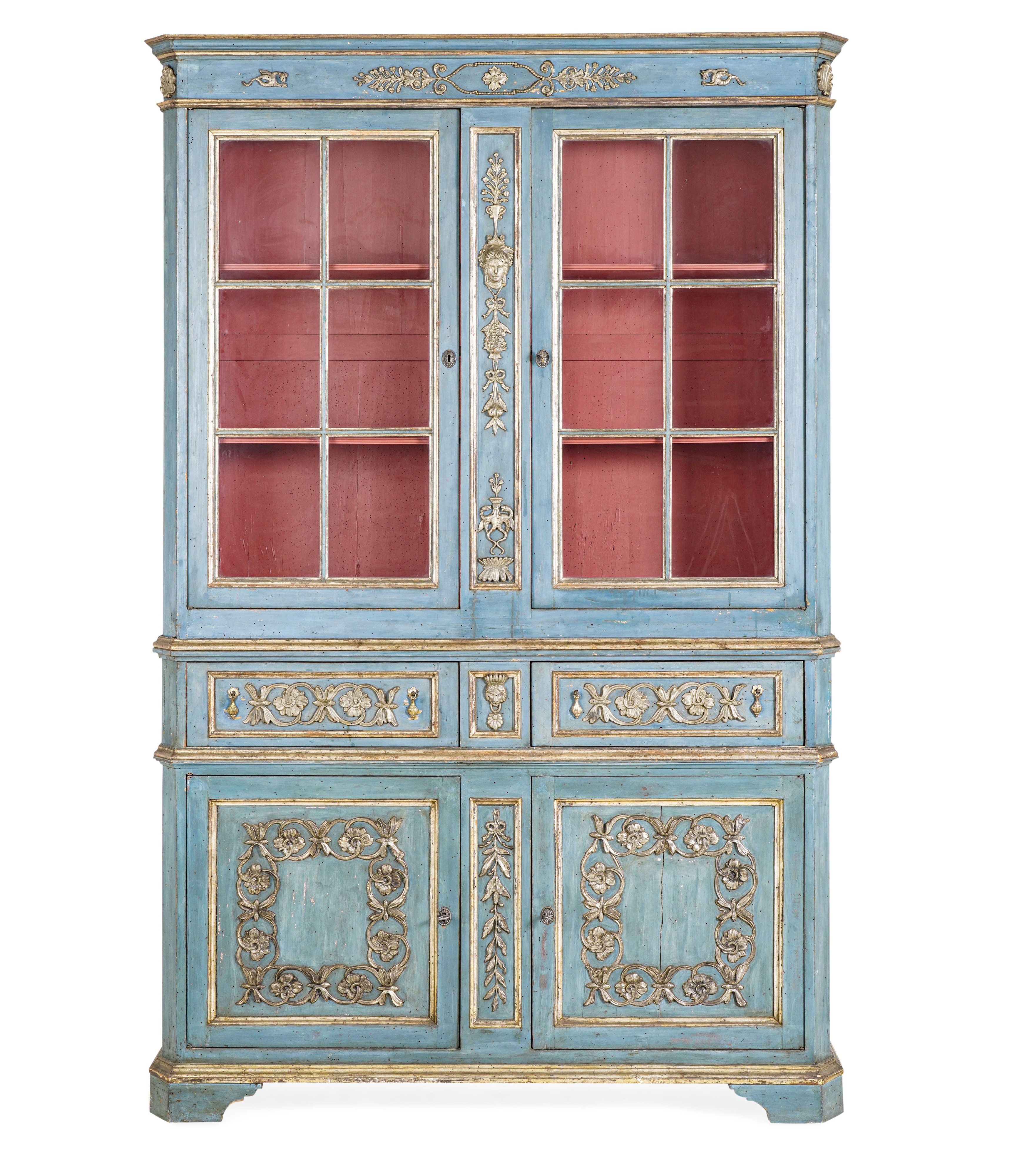 Profili e cornicette argentati, decori in rilievo a mascheroni, candelabra, nastri e motivi concatenati. Parte superiore a due ante a vetri, parte inferiore a due sportelli e due cassetti (lacca e argentatura di epoca posteriore)