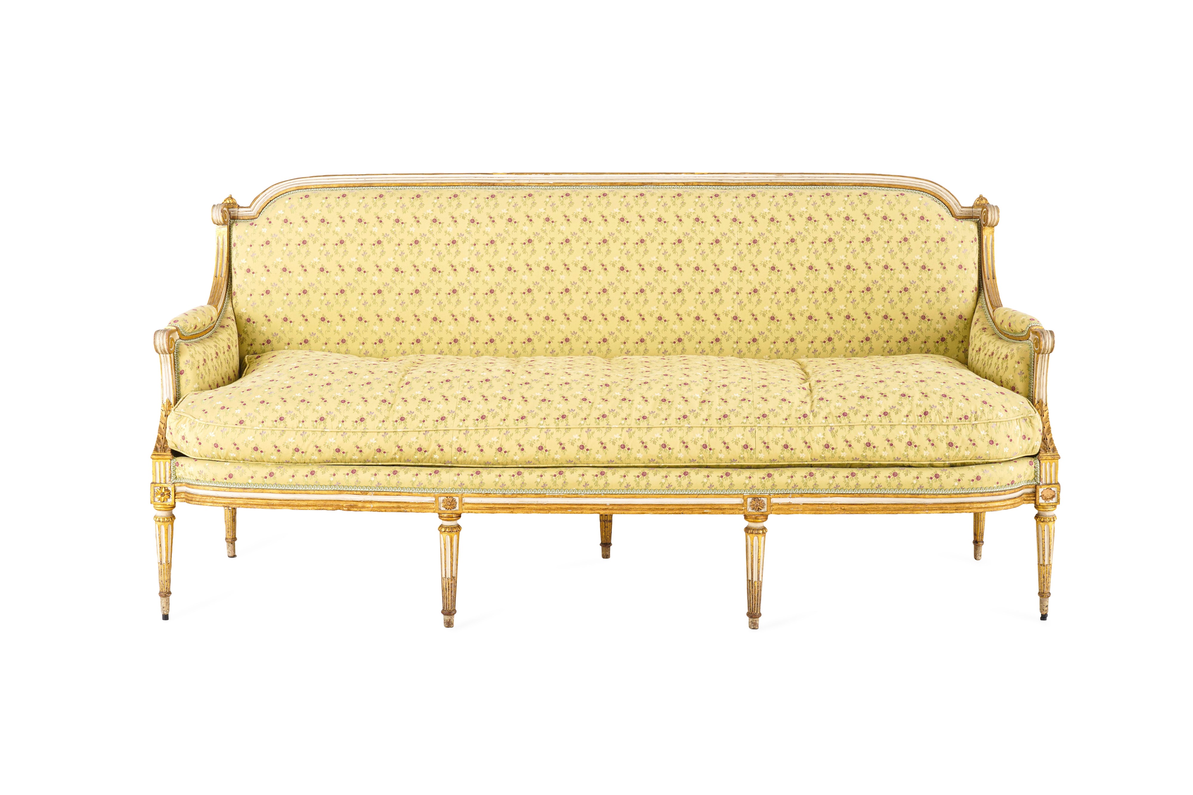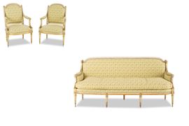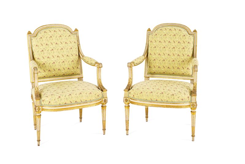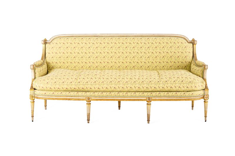 Fornitura da salotto in legno intagliato, laccato e dorato. Francia, XIX secolo