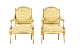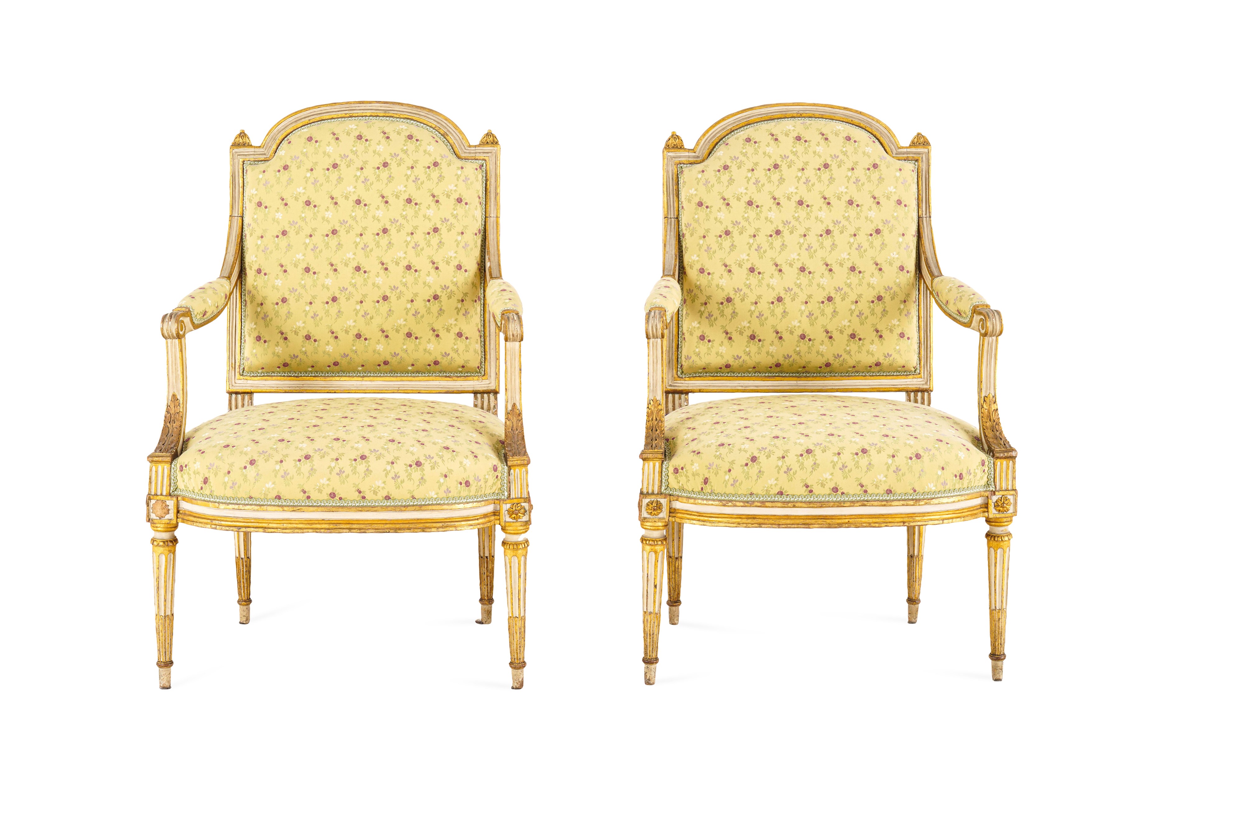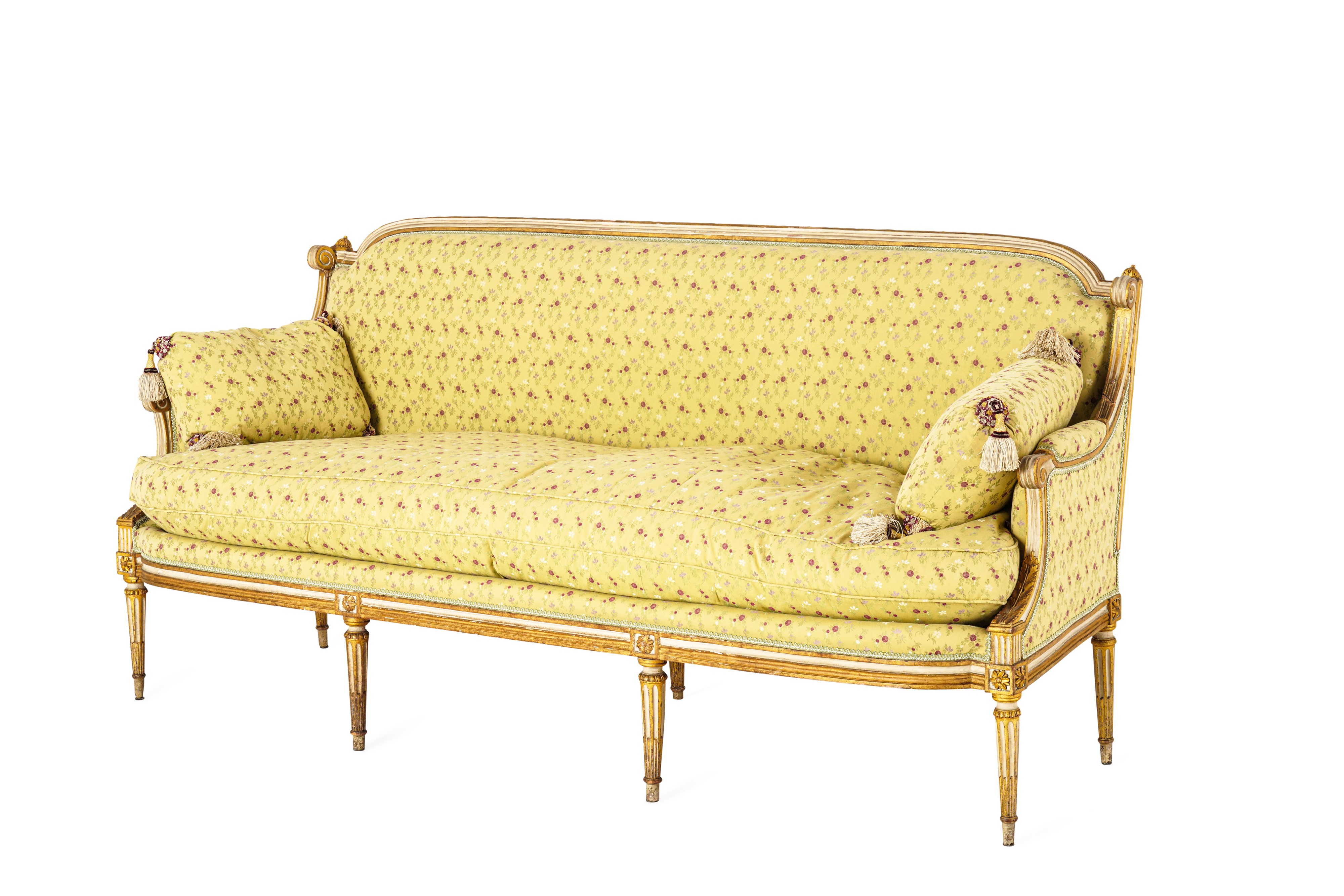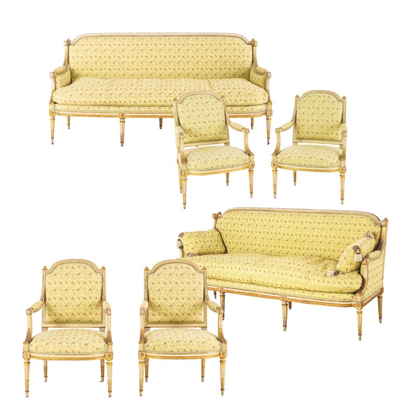 Fornitura da salotto in legno intagliato, laccato e dorato. Francia, XIX secolo