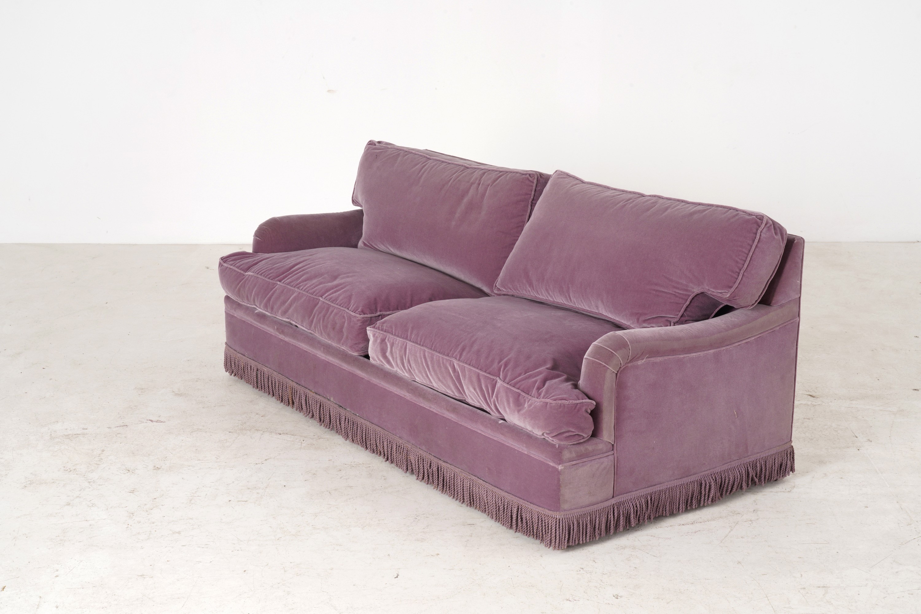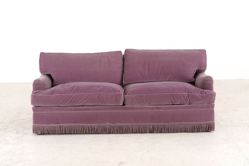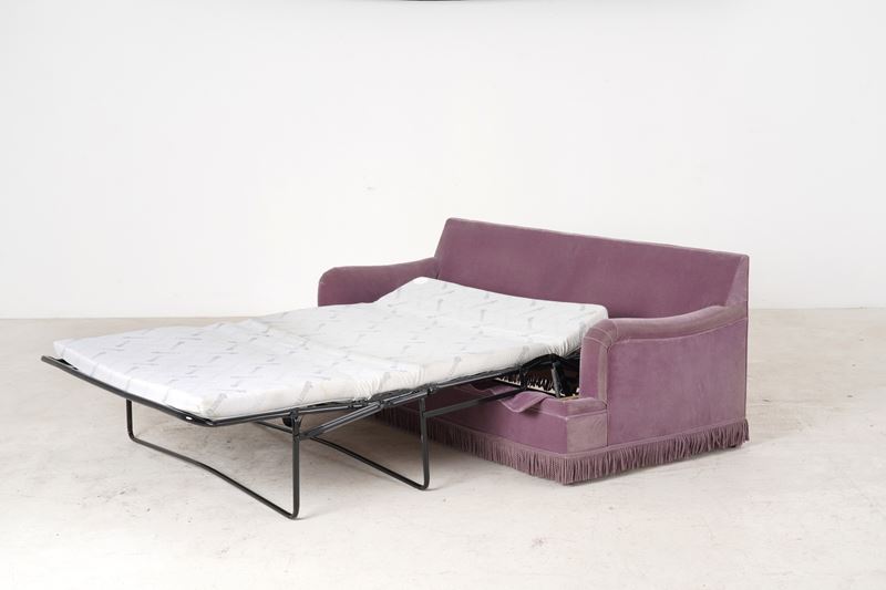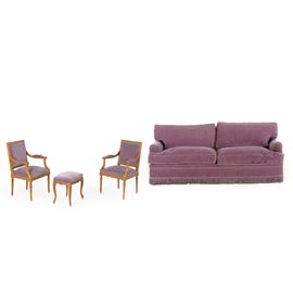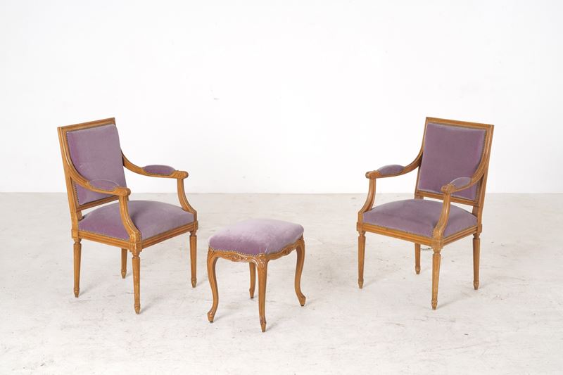 Composta da divano letto, coppia di poltrone in legno intagliato stile Luigi XVI e panchetto, imbottiti e rivestiti in velluto viola