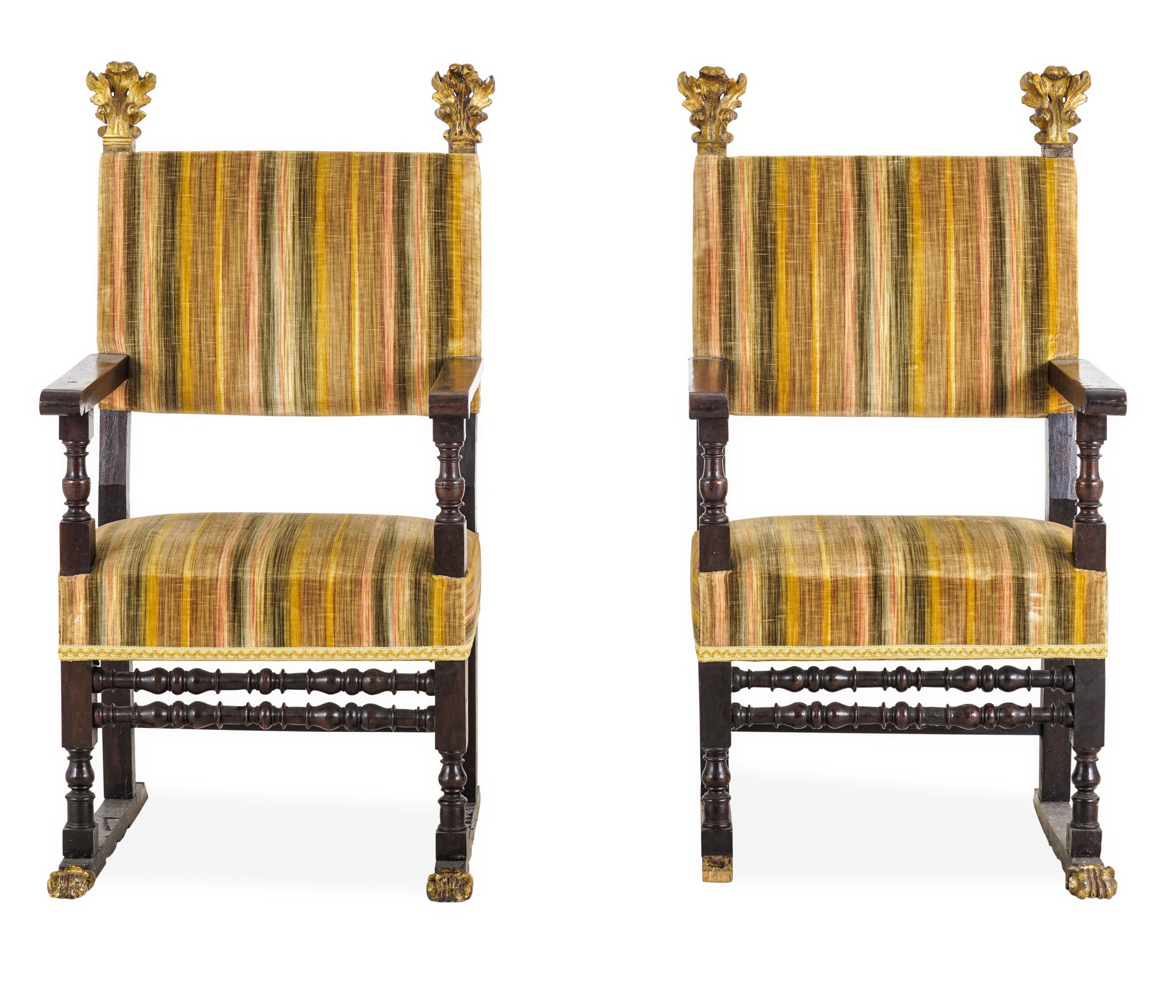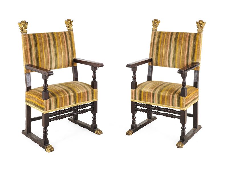 Braccioli e gambe a rocchetto, elementi decorativi in forma di fiamme e piedi ferini in legno intagliato e dorato, seduta e schienale imbottiti
