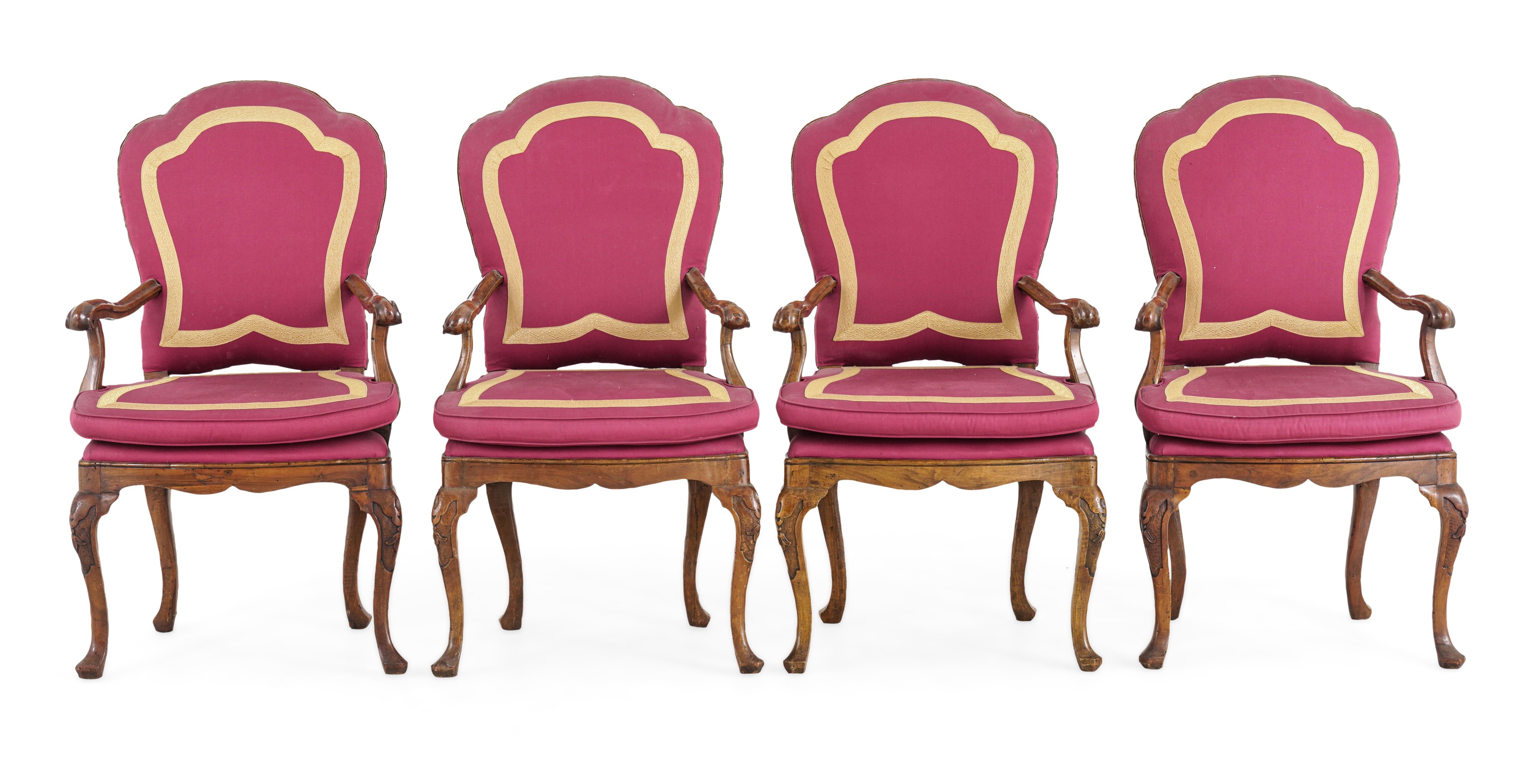 Quattro poltrone Luigi XV in legno di noce. Bologna, XVIII secolo