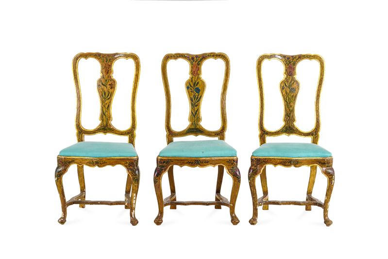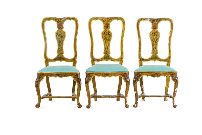 Seduta imbottita, schienale a cartella, gambe e traverse mosse, decoro floreale (laccate in epoca posteriore). Si aggiungono nel lotto due sedie moderne di stile analogo