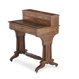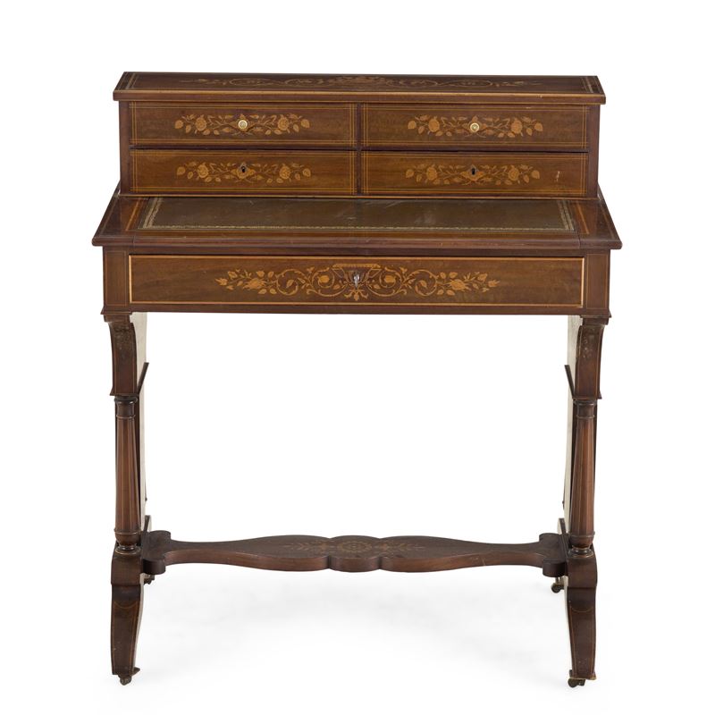 Lastronato, intarsiato e filettato, un cassetto nella fascia e quattro cassettini nell'alzata, piano estraibile rivestito in pelle impressa in oro, gambe arricchite da colonnine tornite
