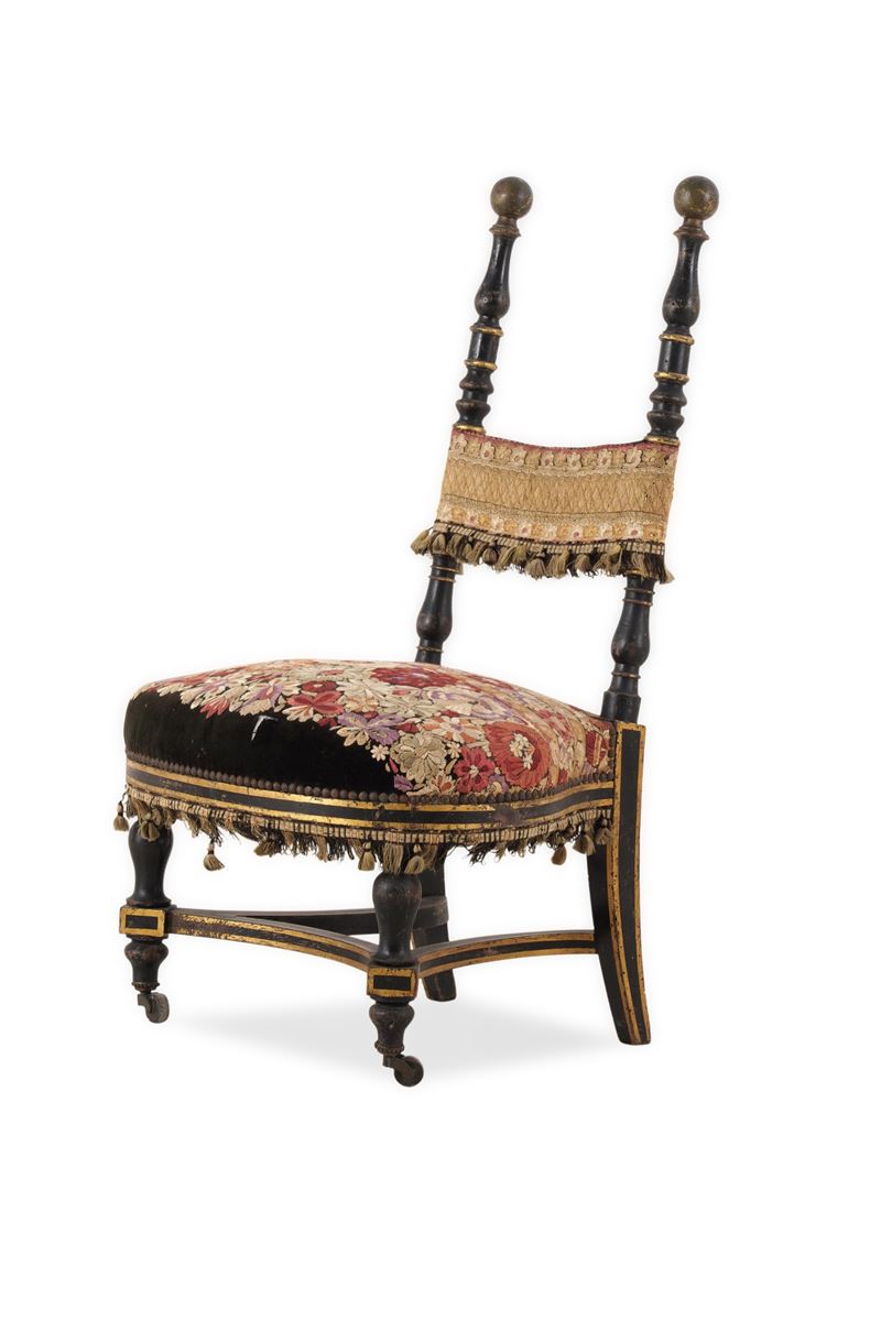 Sedia da balia in legno intagliato, dipinto e dorato. XIX secolo