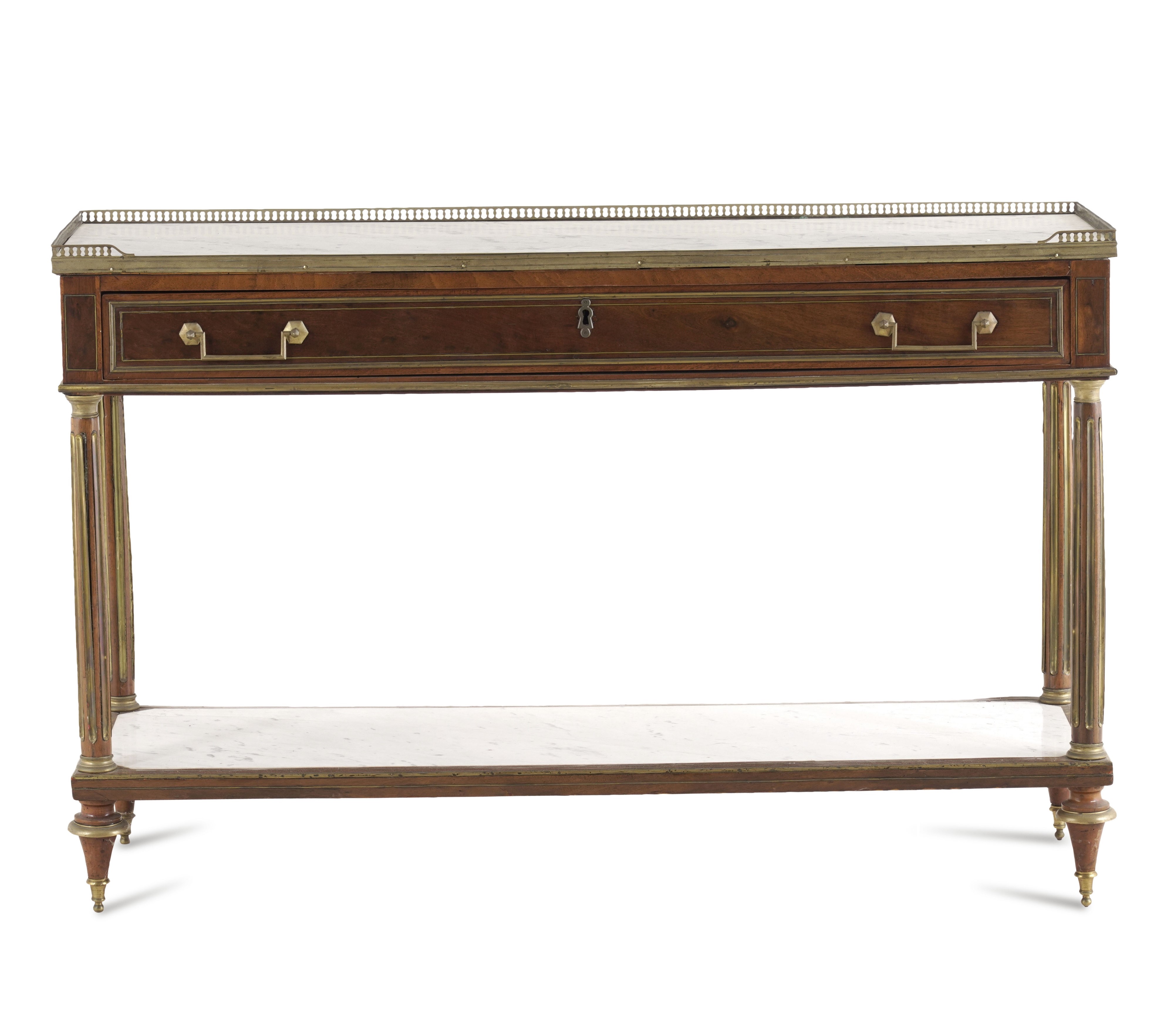 Un cassetto nella fascia, due piani in marmo incassati, quello superiore entro ringhierina traforata, gambe a colonna scanalata