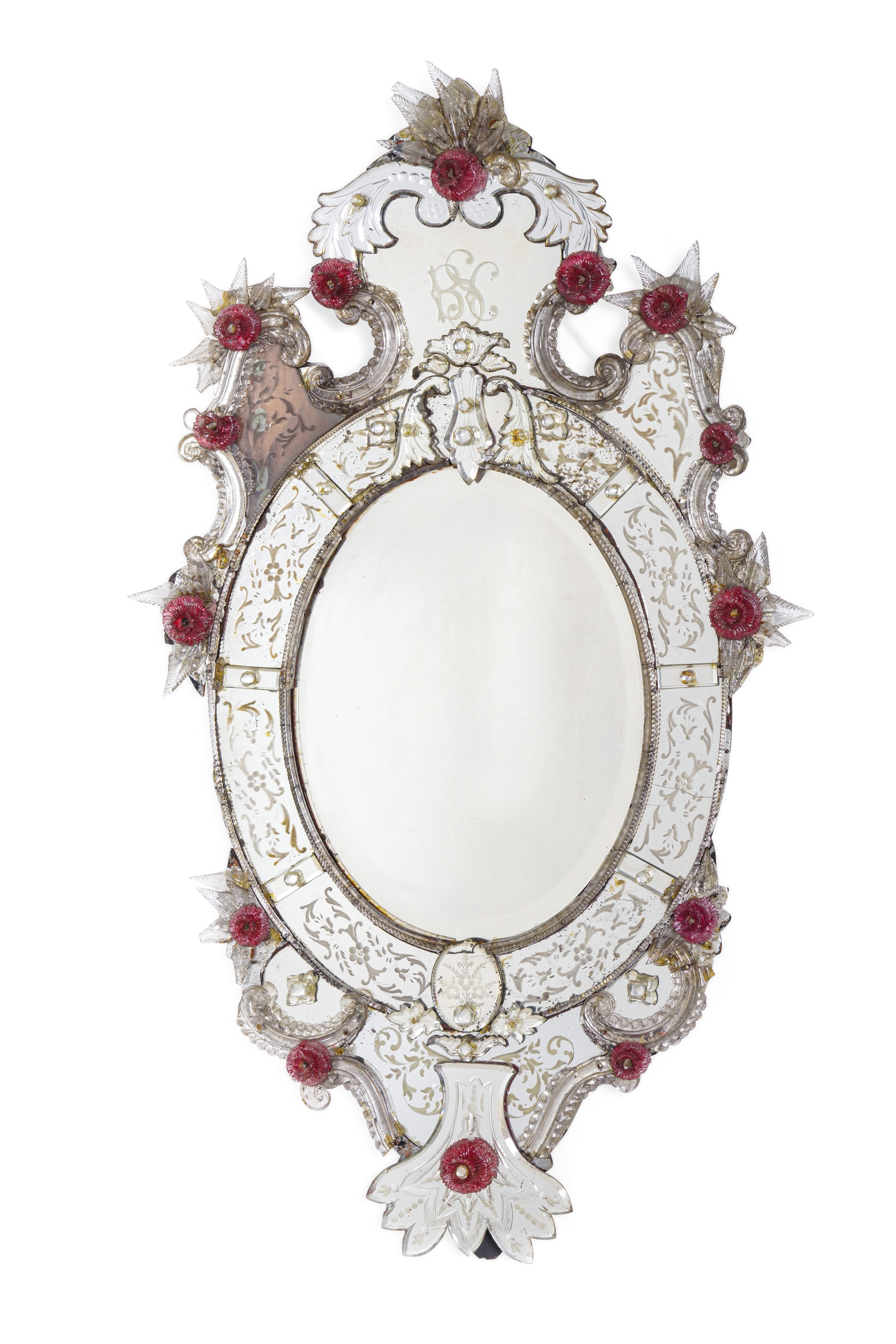 Cornice sagomata a riserva ovale con specchi incisi e applicazioni decorative in vetro incolore e fiori policromi