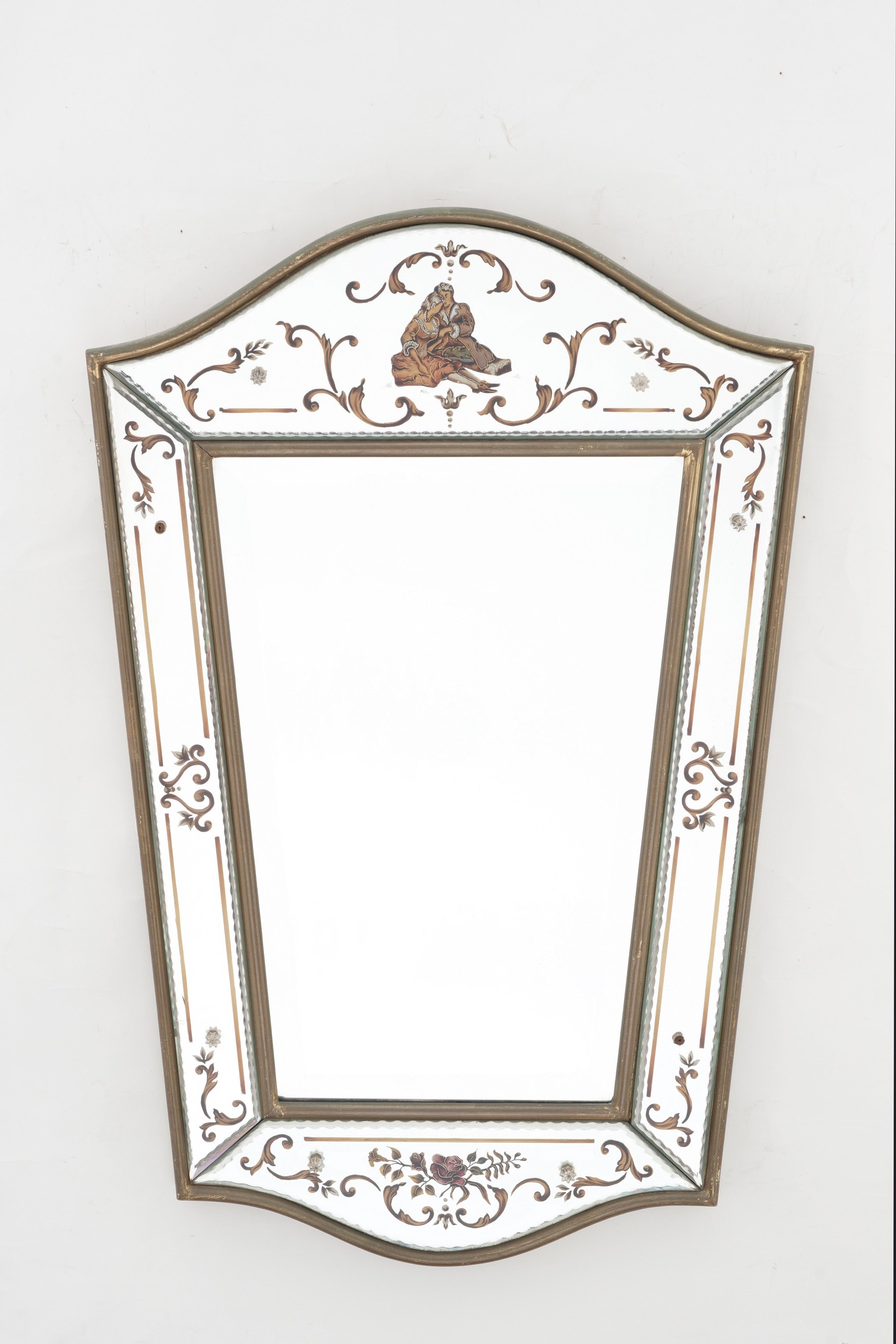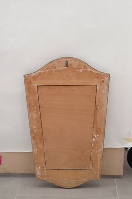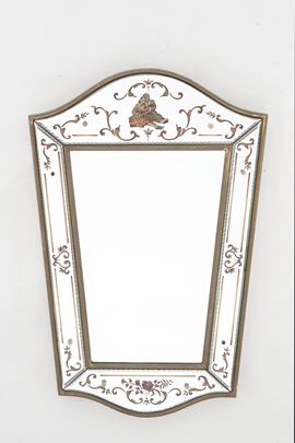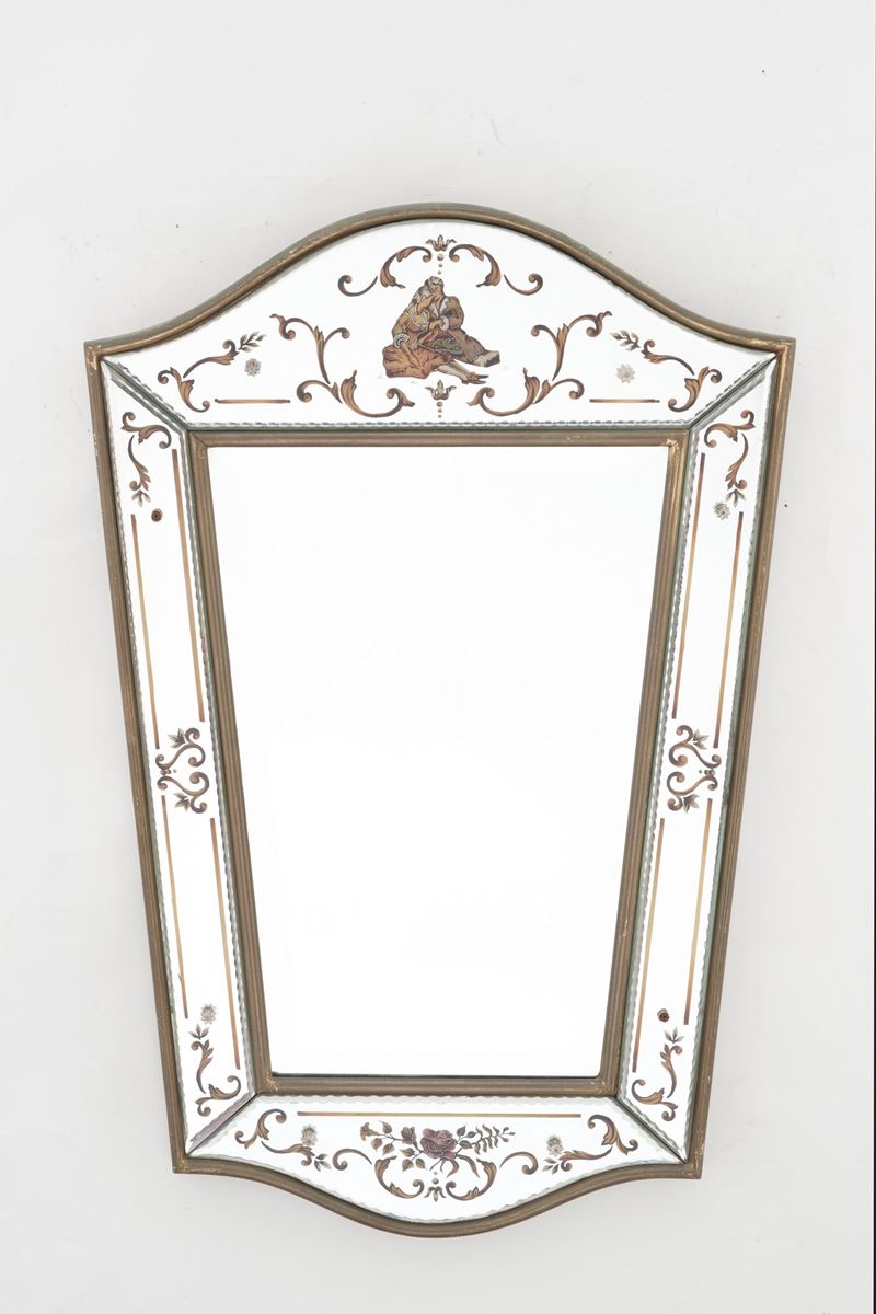 Cornice a specchio dipinto in policromia a motivi floreali, volute e scena galante