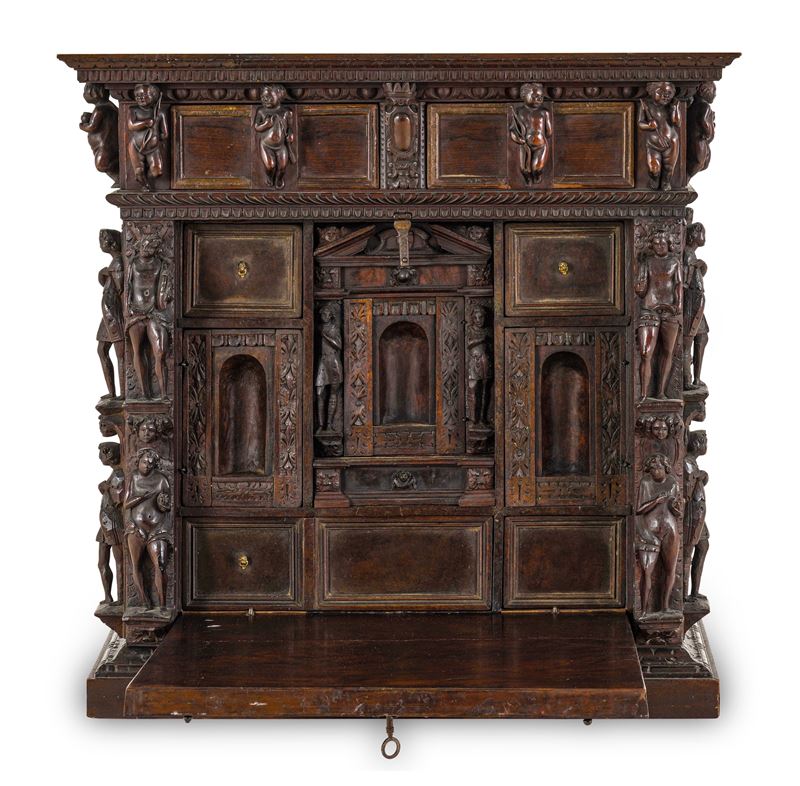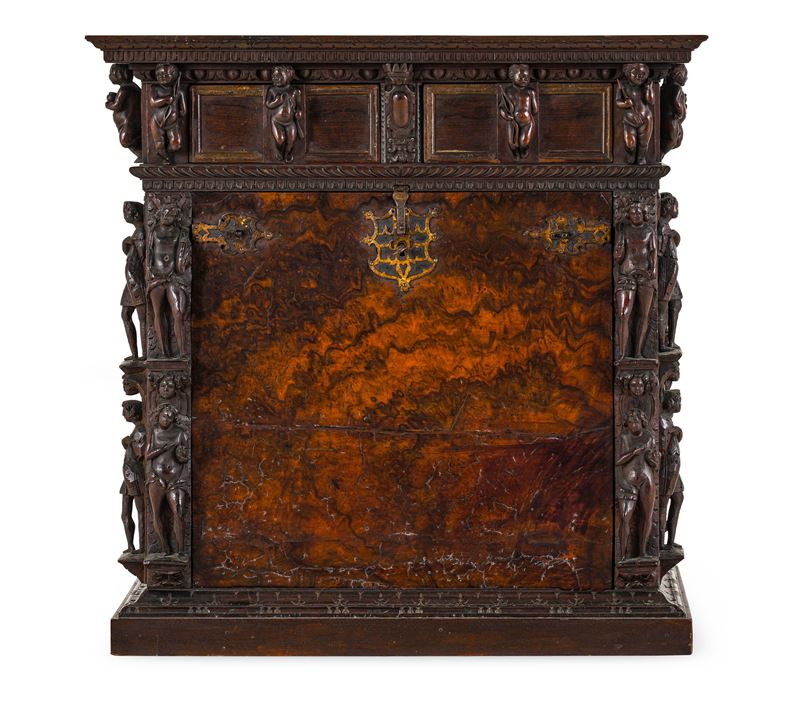 Noce scolpito a patina scura e radica, cappello e fasce con modanature intagliate, due cassetti nella fascia superiore con maniglie scolpite a putti e stemma coronato al centro, anta a calatoia celante scarabattolo a prospetto architettonico con cassettini, decorato con lesene angolari a figure di gusto classico a tutto tondo su mensole con mascheroni, base modanata (restauri e sostituzioni)