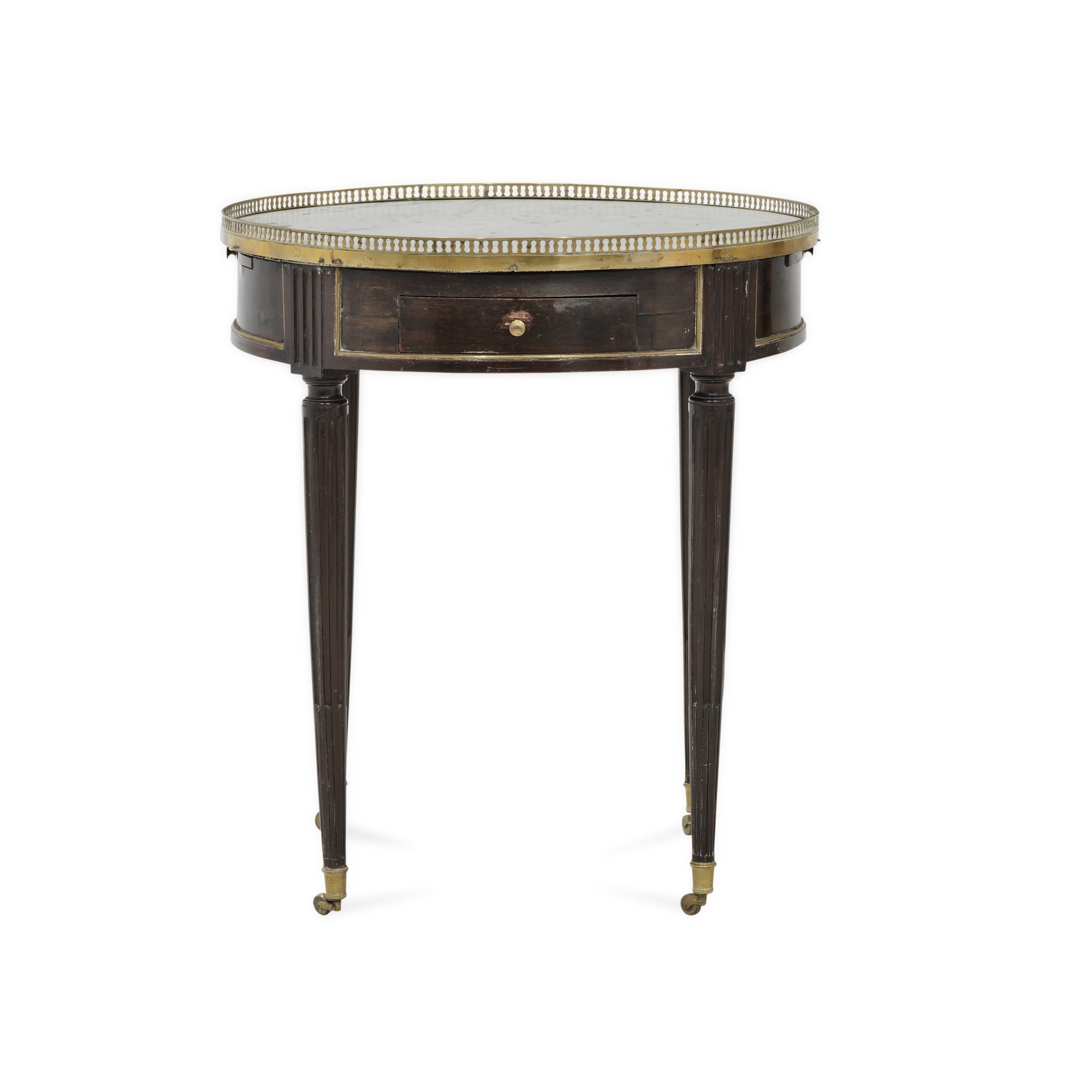 Cornicette e ghiera in ottone, due cassetti e due tiretti nella fascia, gambe scanalate munite di rotelle