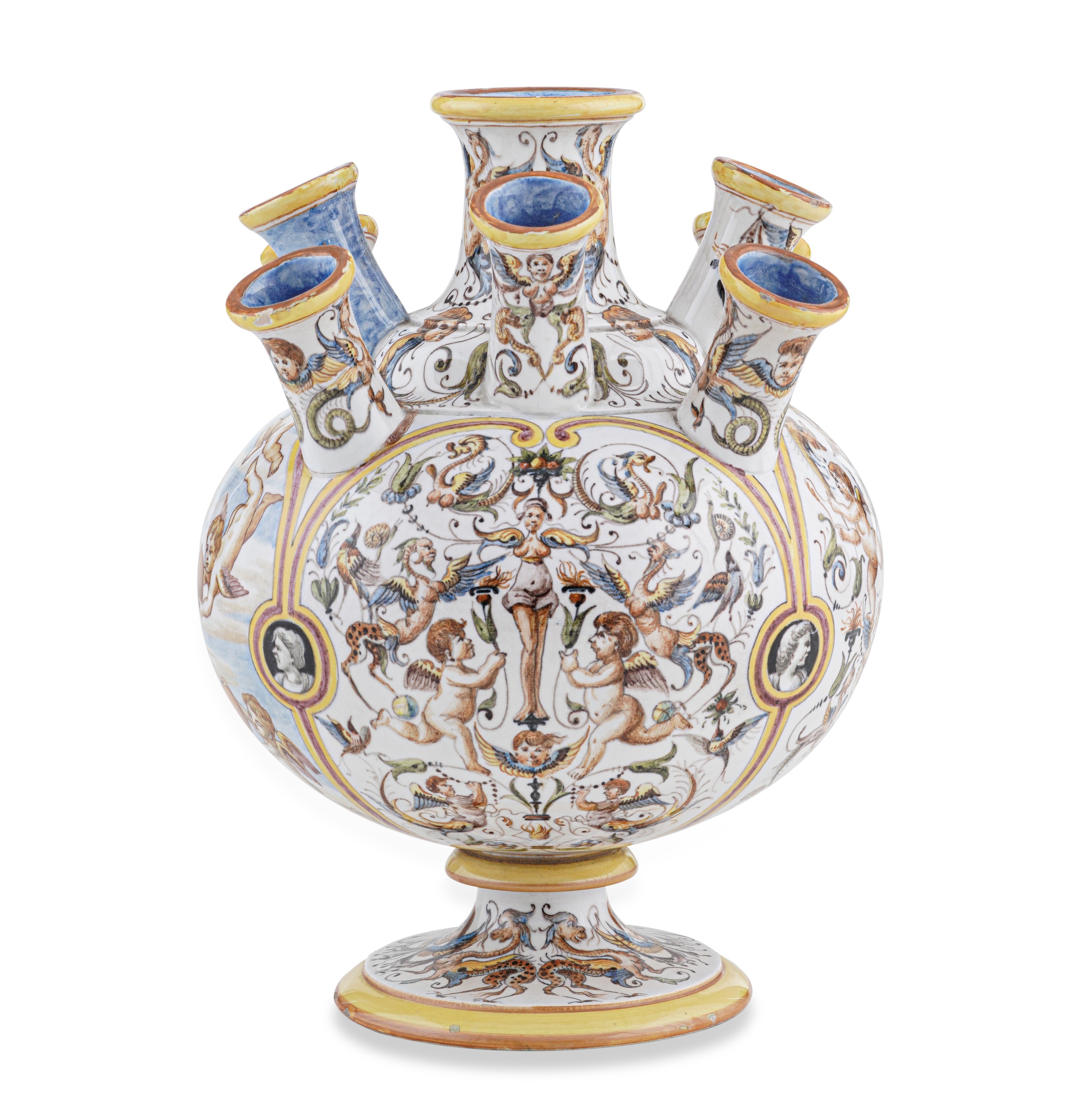 La tulipaniera, dal corpo globulare su basso piede, presenta nove beccucci per i fiori. La decorazione policroma é nello stile della maiolica rinascimentale di Urbino a "Raffaellesche" racchiuse in quattro riserve. Su quella frontale otto putti sorreggono sei palle e una corona che rappresenta lo stemma dei Medici.