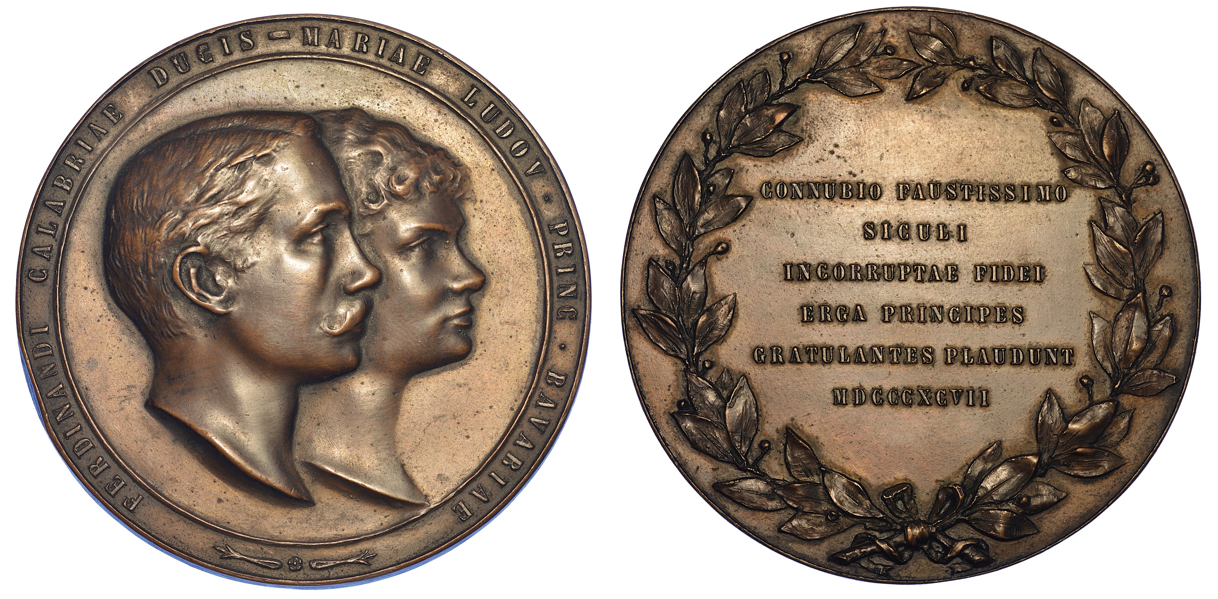 Teste a d. dei consorti Maria Ludovica e Ferdinando Pio, duca di Calabria. R/ Legenda in sei righe entro corona di alloro. g. 123,53. Diam. mm. 65,50. Bronzo. Colpo al diritto. q.SPL