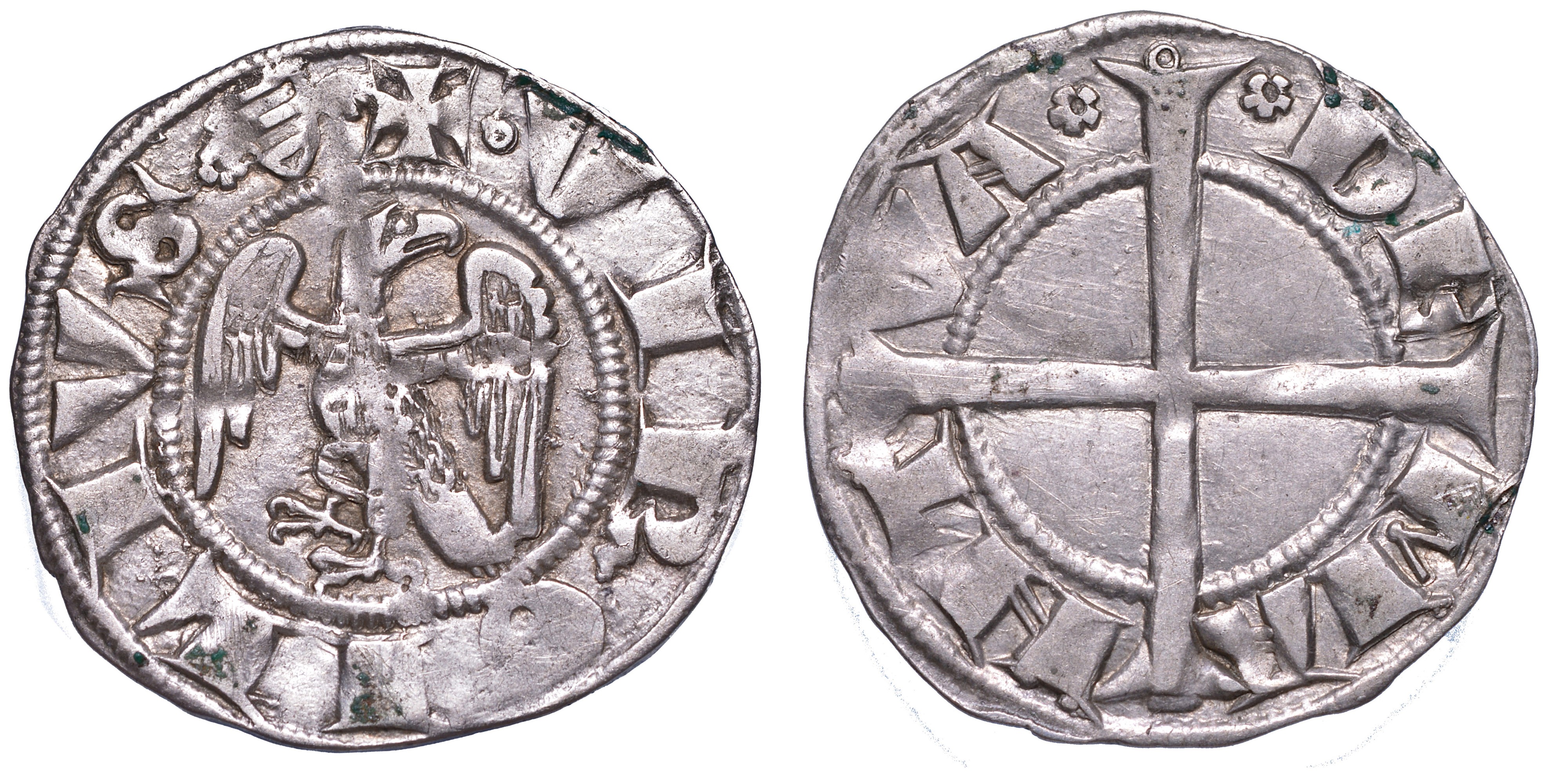 Aquila ad ali spiegate. R/ Croce intersecante. CNI 3/6. MIR 371. Rara. g. 1,48. Diam. mm. 20,01. Arg. BB