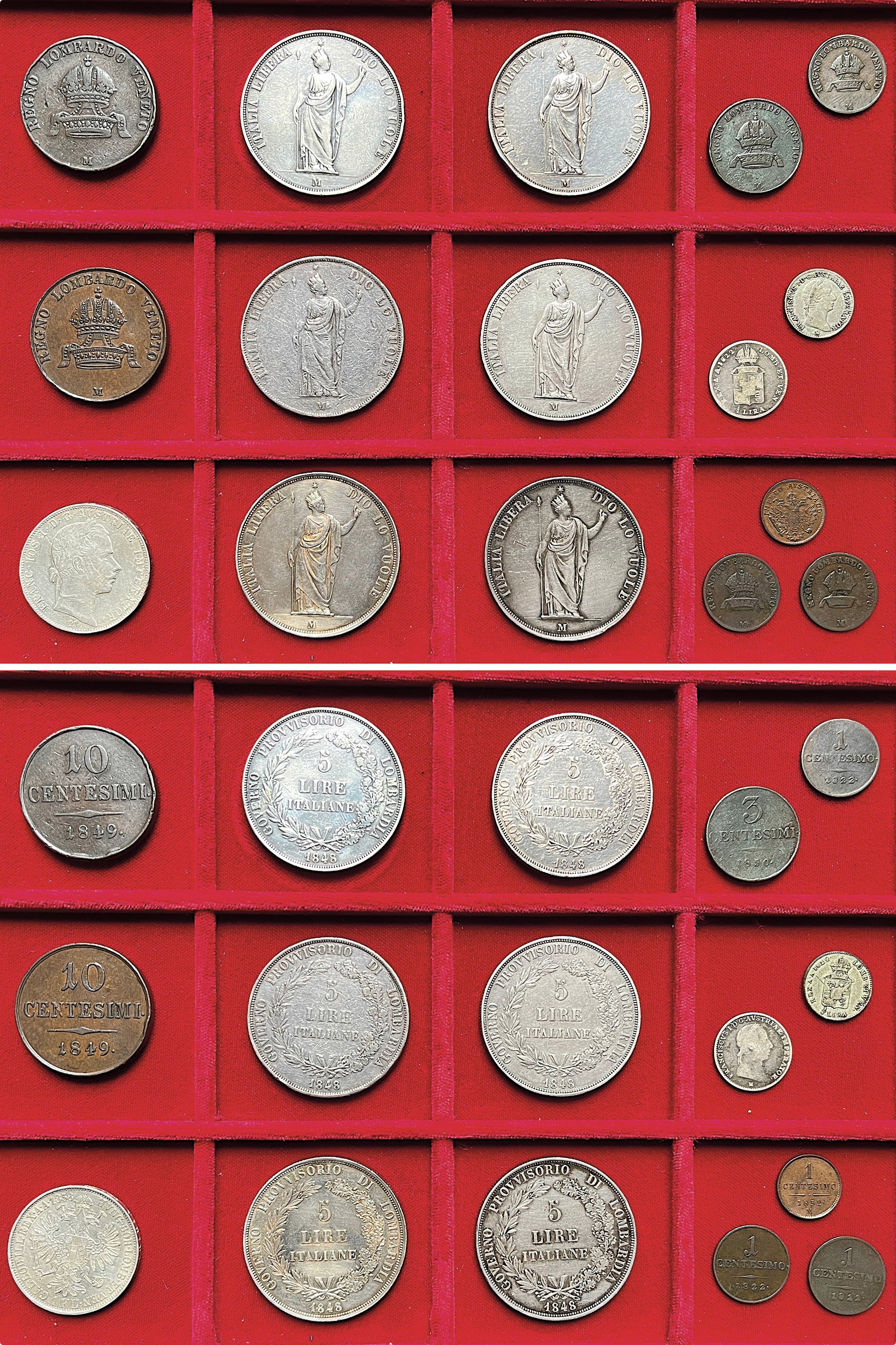 Monetazione mista del Regno Lombardo-Veneto e del Governo Provvisorio di Lombardia. Si segnalano: GOVERNO PROVVISORIO, 1848. 5 Lire 1848 (6 esemplari, uno con tracce di appiccagnolo). FRANCESCO GIUSEPPE D’ASBURGO-LORENA, 1848-1866. Fiorino 1858 - 10 Centesimi 1849. Esemplari in argento e rame. Conservazioni da MB a BB/SPL.