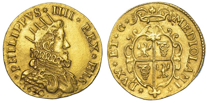 Busto a d. corazzato e con testa radiata. R/ Stemma di Milano, ornato ai lati da due teste di ariete e sormontato da corona con rami di palma e di olivo. Tra lo stemma e la corona, maschera tra festoni. Crippa 3/C. CNI tipo 31/54. Molto raro. g. 12,88. Diam. mm. 28,05. Oro. Bellissimo esemplare, di modulo largo e completo. SPL