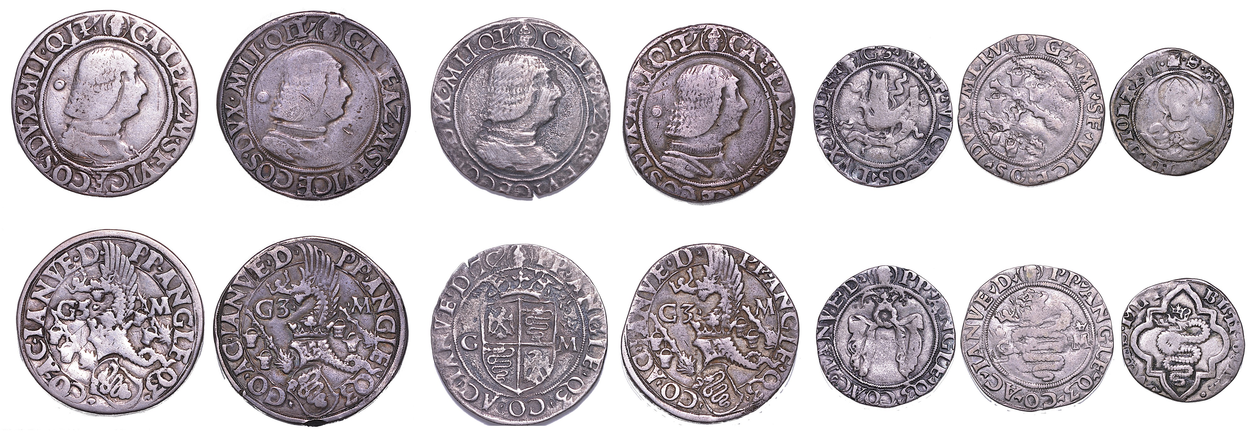 Testone (3 esemplari) - Mezzo Testone - Grosso da 5 Soldi - Grosso da 4 Soldi - Soldo (a nome di Galeazzo e di Bianca Maria Visconti). Crippa 6-8-10-13-2. Esemplari in argento. Conservazioni da MB a MB/BB.