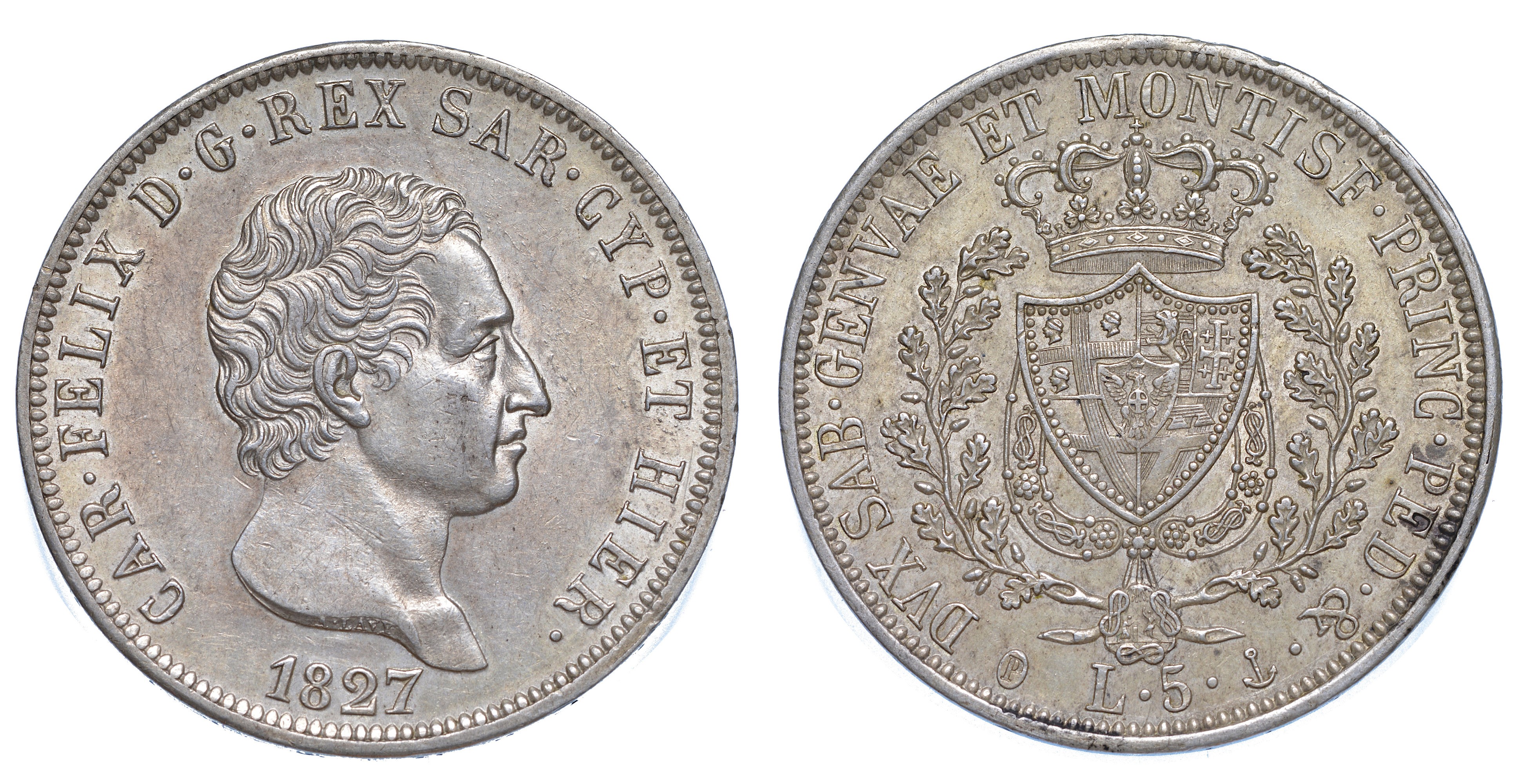 REGNO DI SARDEGNA. CARLO FELICE DI SAVOIA, 1821-1831. 5 Lire 1827. Genova.