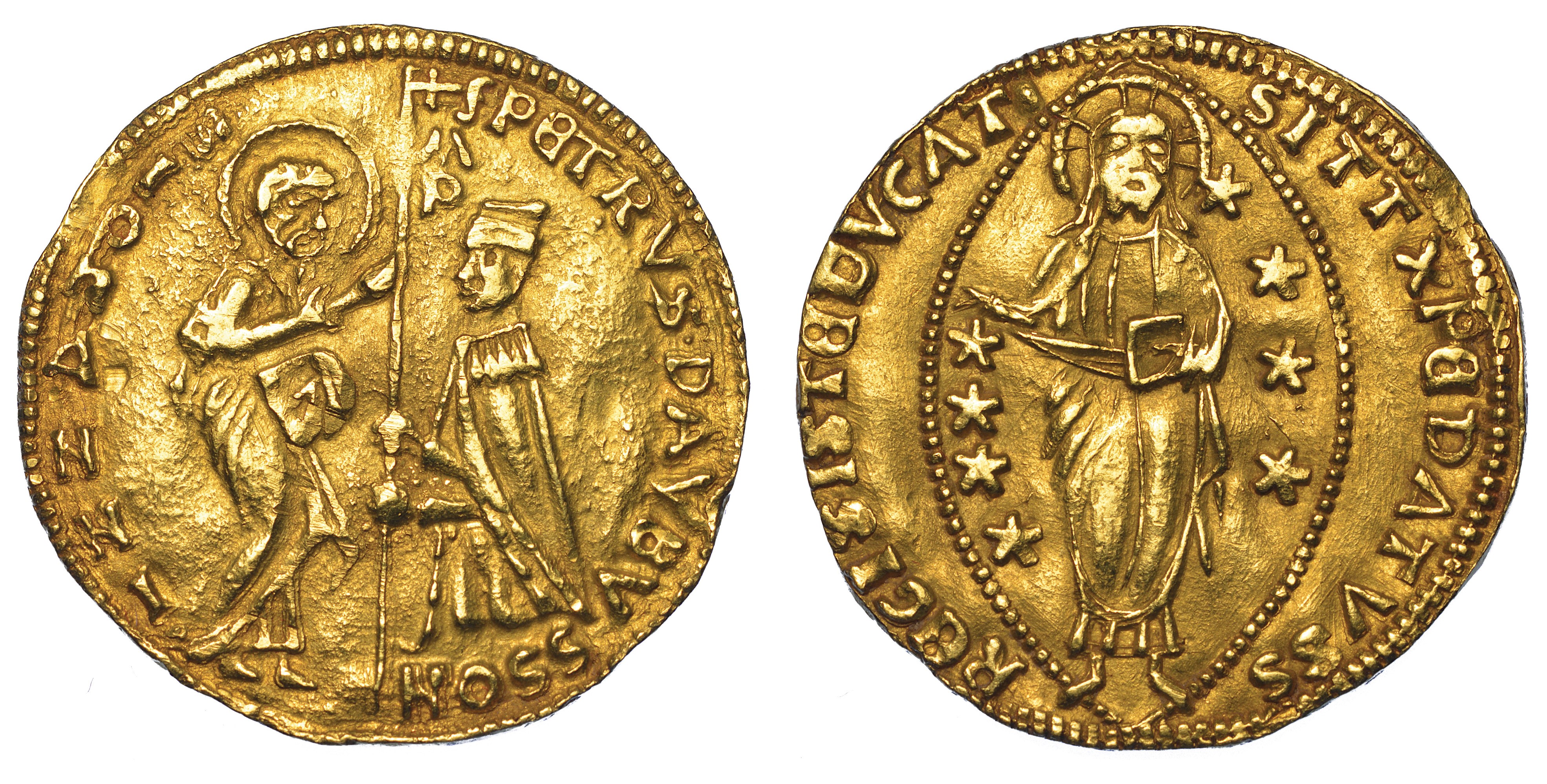 Il Santo in piedi porge il vessillo al doge genuflesso. R/ Il Redentore in piedi in aureola ellittica. Metcalf 1226. Gamb. 380. g. 3,46. Diam. mm. 21,90. Oro. BB