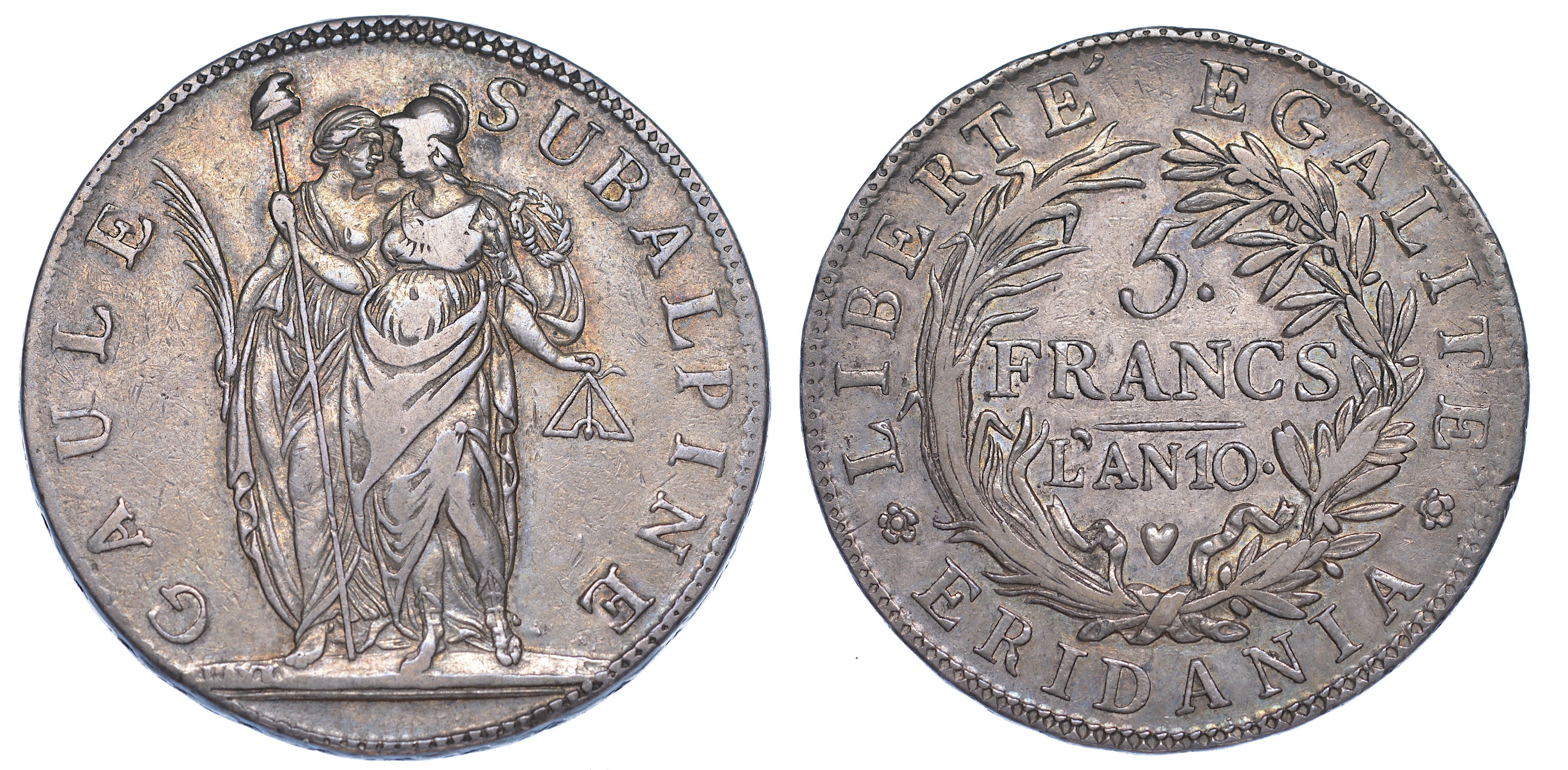 Personificazioni stanti della Francia e della repubblica Subalpina. R/ Valore e data in tre righe fra rami di alloro e di palma. Gig. 4. Rara. g. 24,84. Diam. mm. 37,27. Arg. Migliore di BB