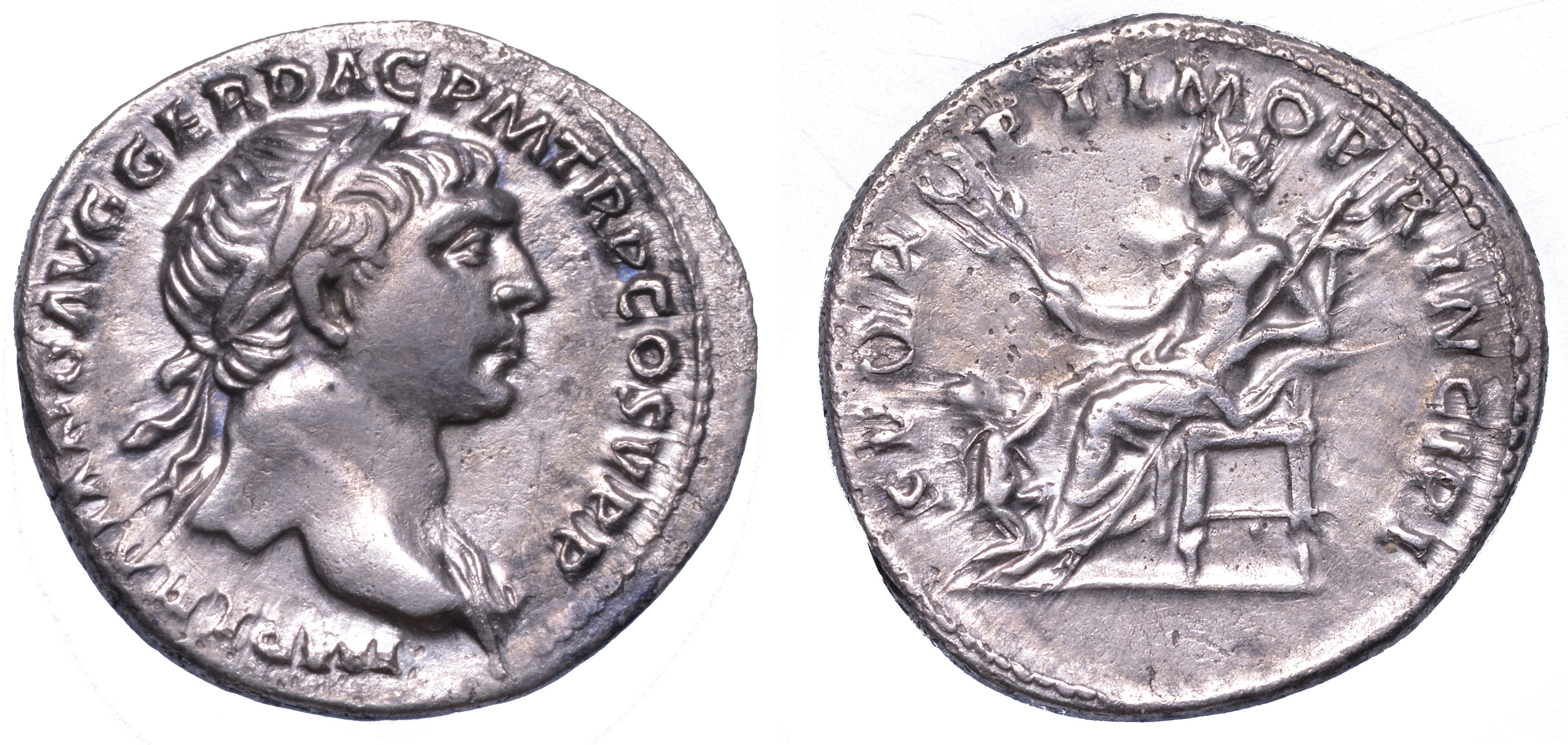 Testa laureata a d. R/ La Pax seduta verso s. tiene ramo di ulivo e scettro; a s., guerriero dacico inginocchiato. RIC 188. g. 3,18. Diam. mm. 18,15. Arg. q.SPL