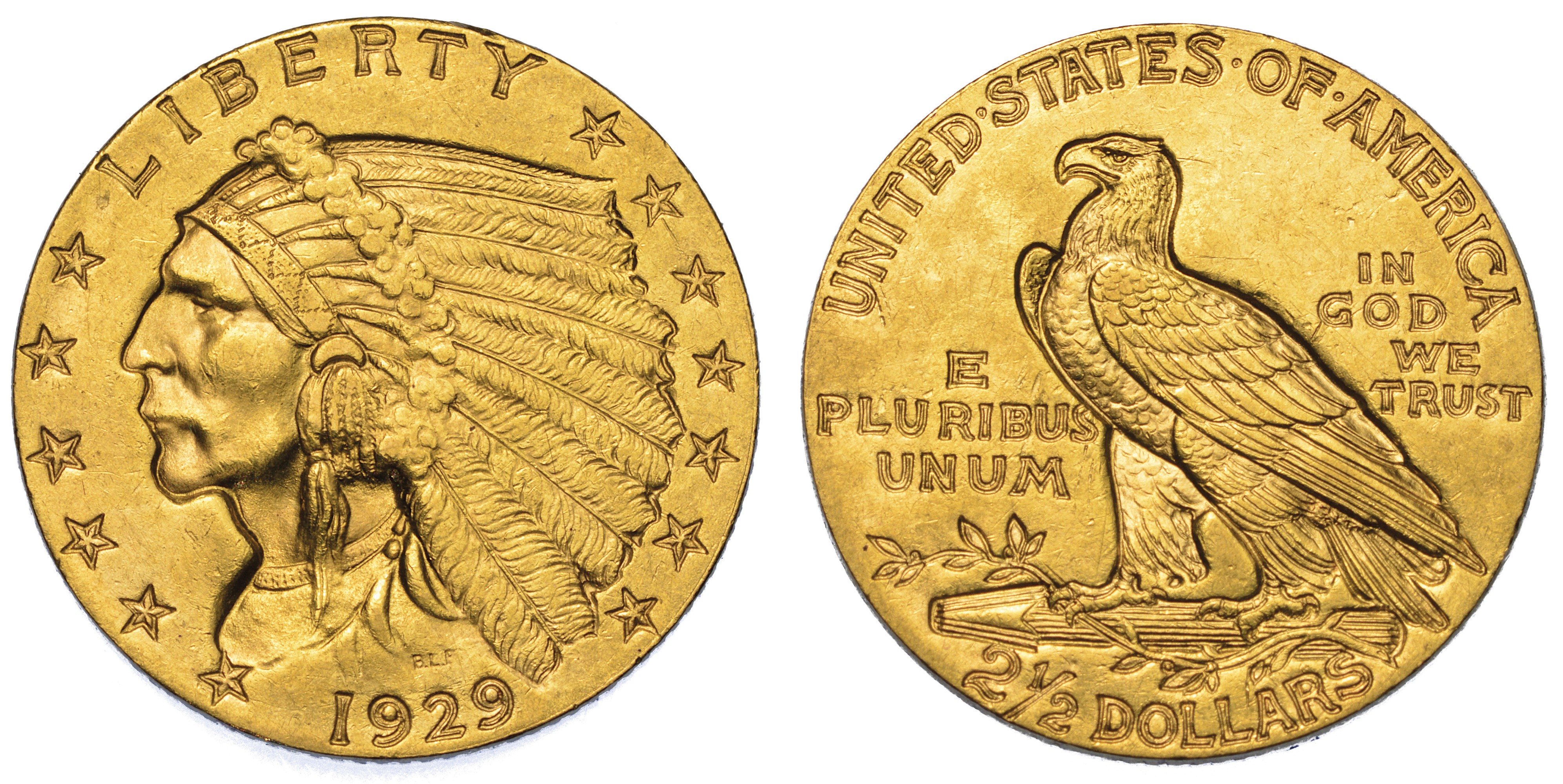 USA. REPUBLIC. 2,5 Dollars "Indian Head" 1929. Zecca di Philadephia, Pennsylvania.